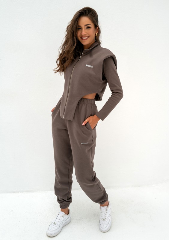 Brązowe spodnie damskie dresowe o swobodnym kroju oversize, wykończone ściągaczami.