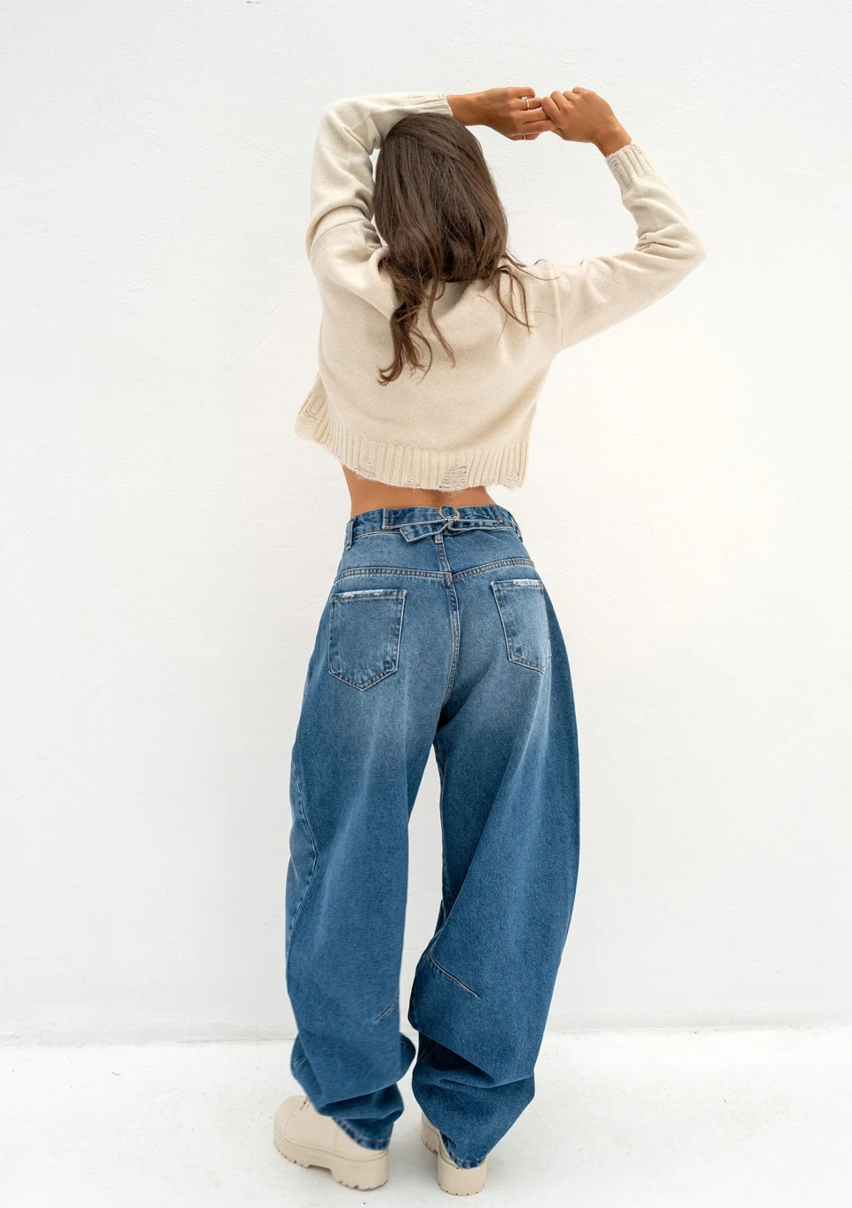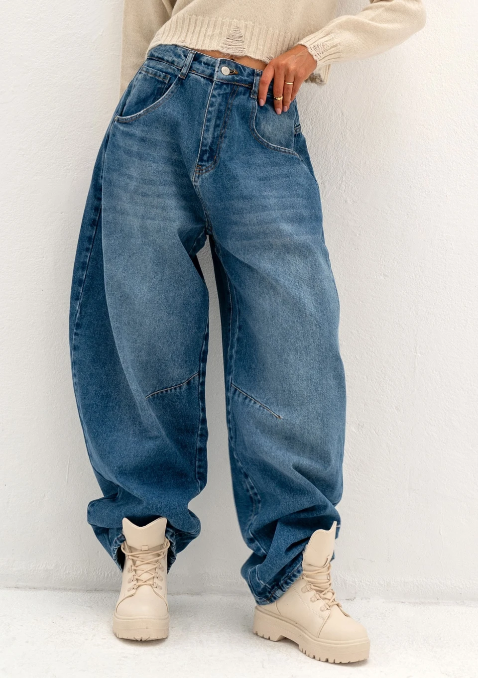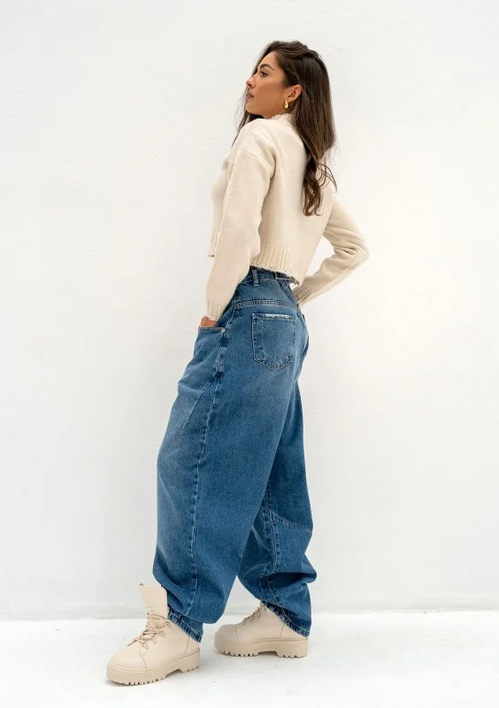 Denim w tak totalnym wydaniu zwróci uwagę. Forma nogawek baloon doda pazura każdej stylizacji. Te wyjątkowe i przede wszystkim modne spodnie jeansowe możesz nosić w dowolny sposób, z równie oversizową górą lub przeciwnie, z drobnymi, dopasowanymi tank topami. W chłodniejsze dni sprawdzą się w casualowych zestawieniach ze swetrami i golfami. Joyo to obecnie nasz najszerszy fason. Został wzbogacony zasuwanymi paskami na pasie z tyłu, dzięki temu będziesz mogła lepiej dopasować ich obwód w talii.