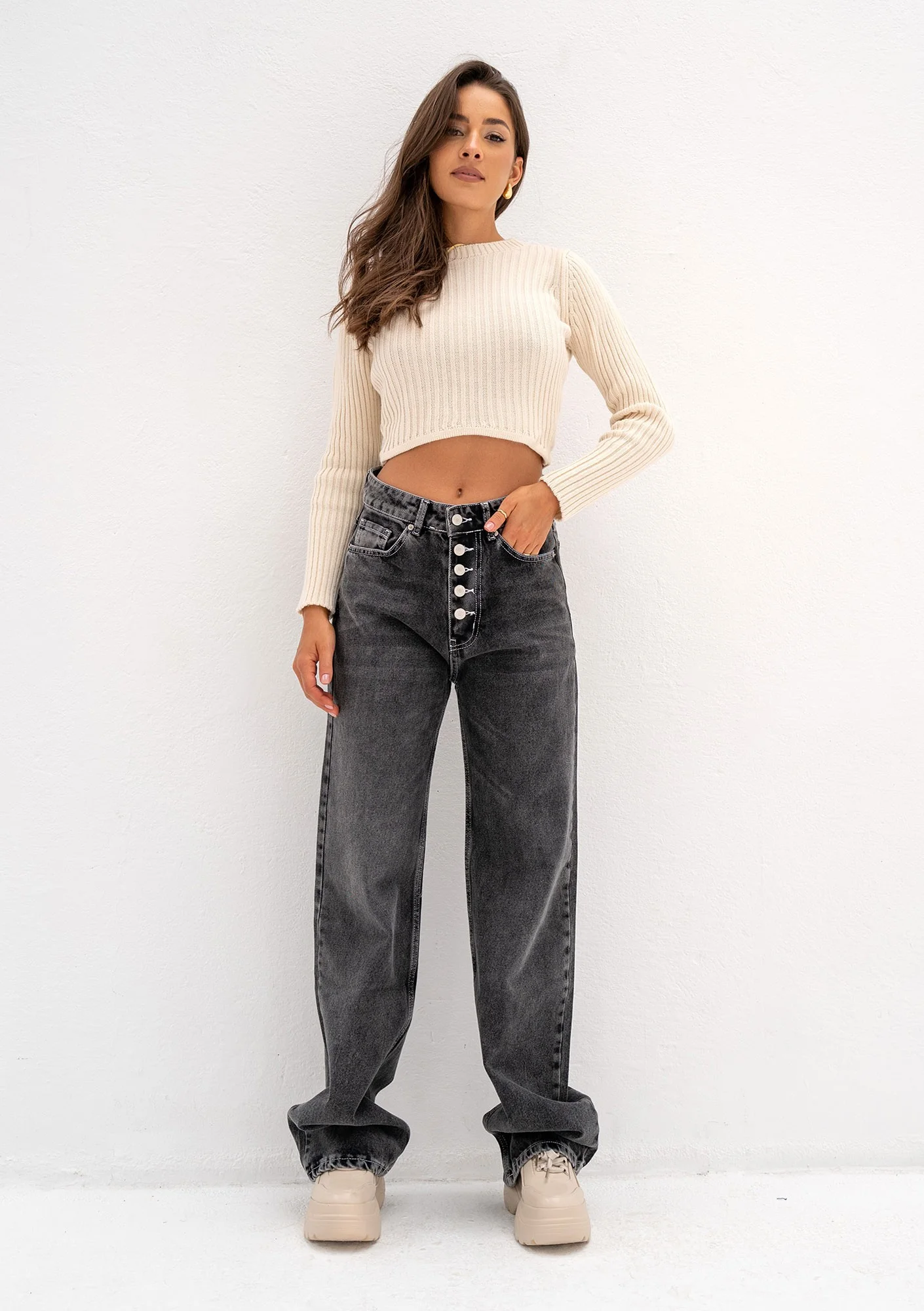 Fason typu straight, z kieszeniami i rozporkiem zapinanym widocznymi guzikami.