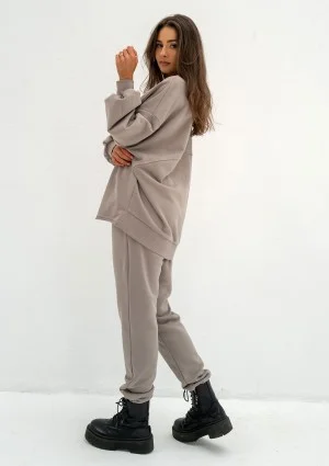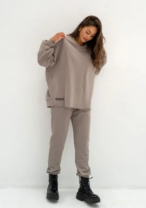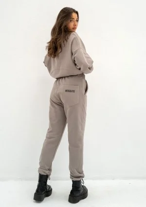 Spodnie dresowe w odcieniu taupe dla zwolenniczek lżejszych i wygodnie luźnych nogawek. Dres został uszyty z miękkiej dzianiny pętelkowej, a w składzie materiału dominuje naturalna bawełna. Ten model wyróżnia się dodatkową kieszenią i dużym czarnym logiem. Do tego fasonu będzie pasowała bluza Lumi i Shire w tym samym kolorze taupe, który jest szarawym beżem.