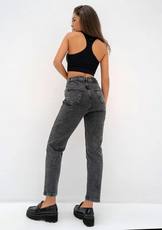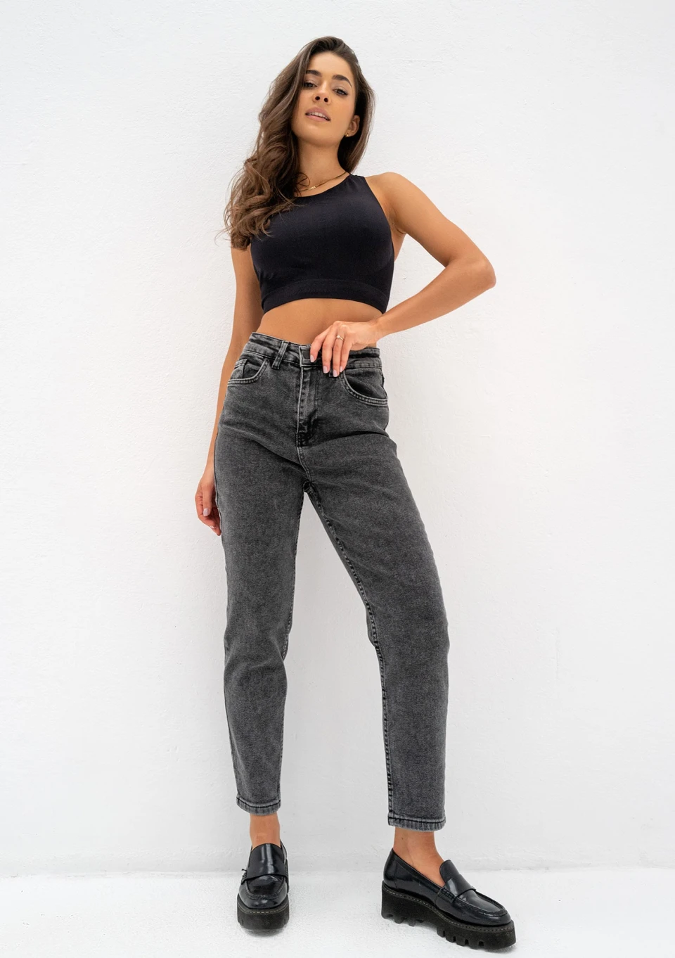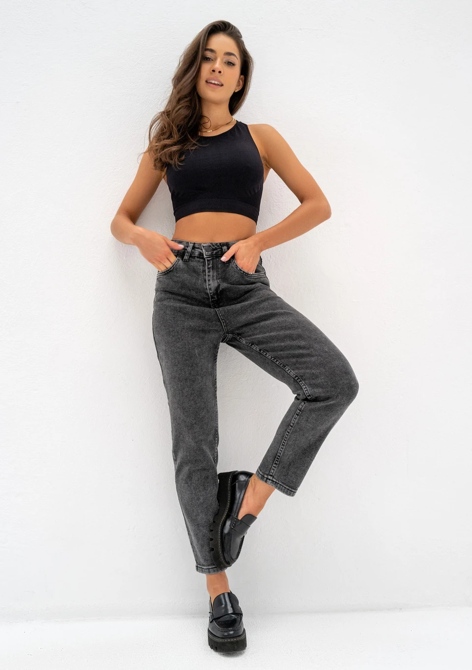 Spodnie jeansowe o kroju mom fit z wysokim stanem i krótszą nogawką. Model z denimu w klasycznym, czarnym kolorze.
