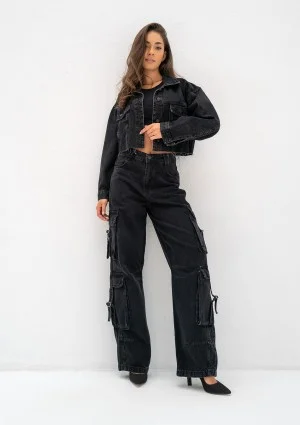 Fason z szeroką nogawką i kieszeniami w stylu cargo.