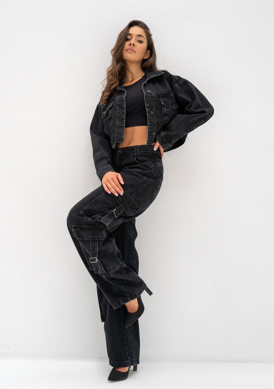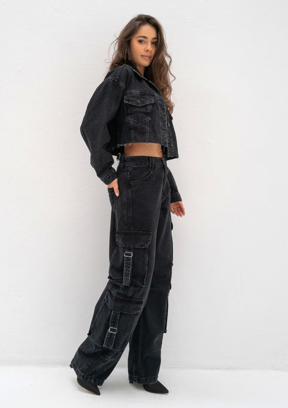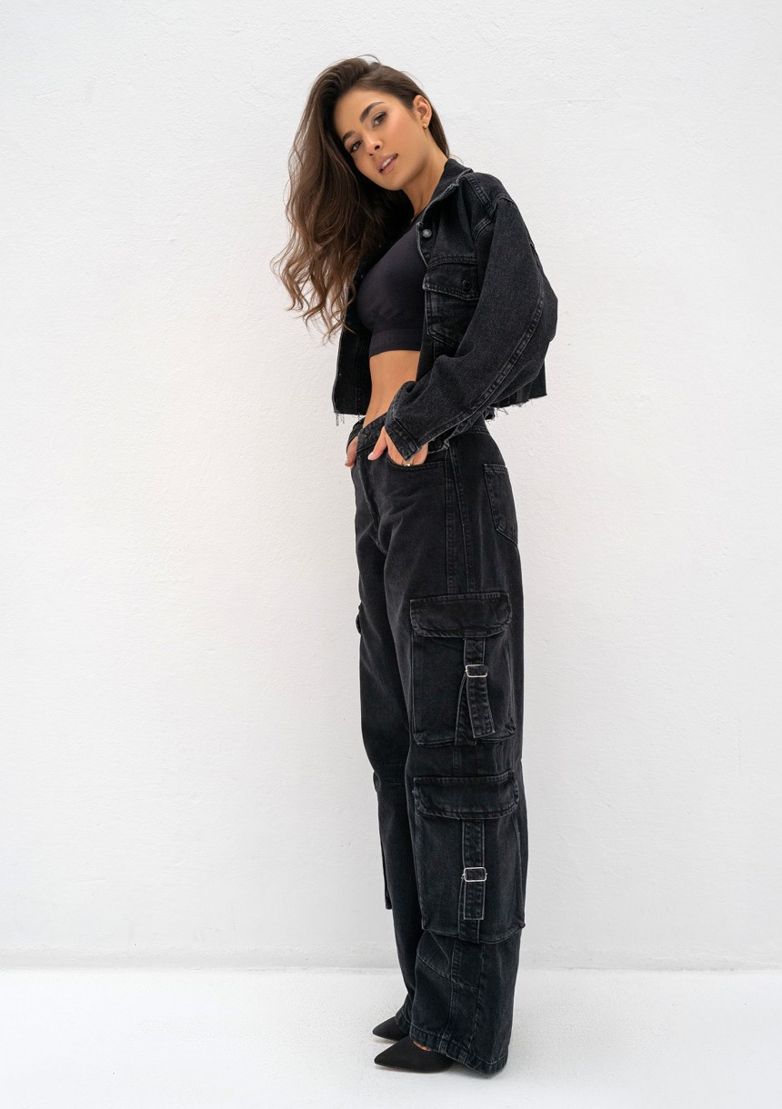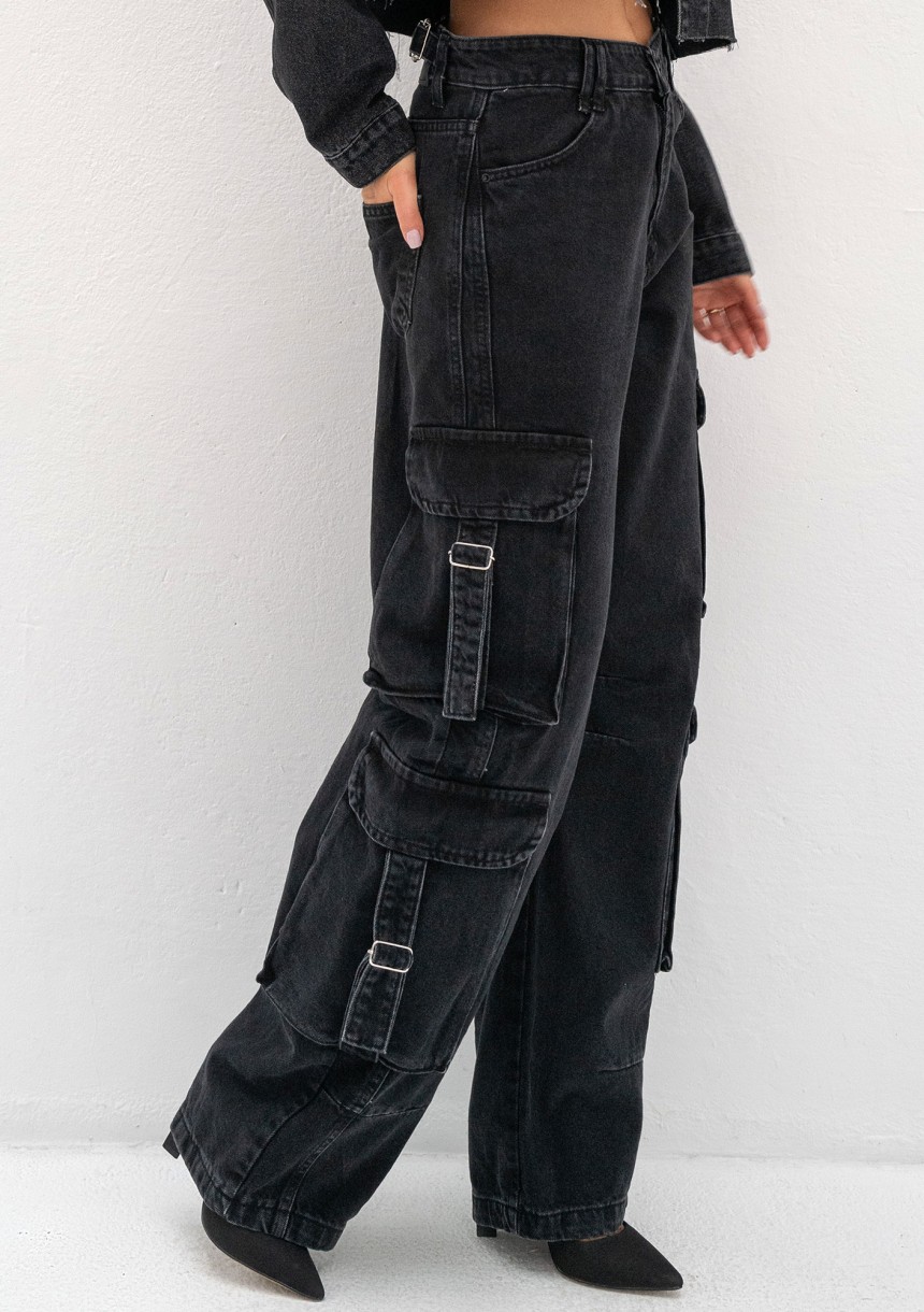 Czarne jeansy damskie z kieszeniami na udach w modnym stylu cargo. Model z szerokimi nogawkami i regulacją obwodu pasa.