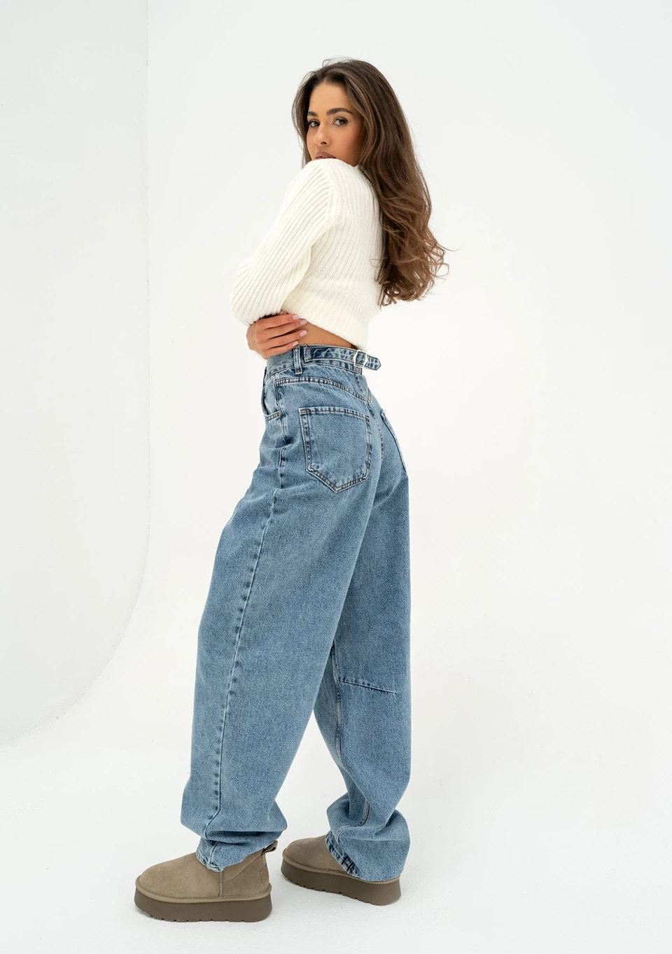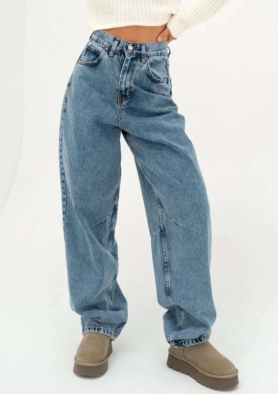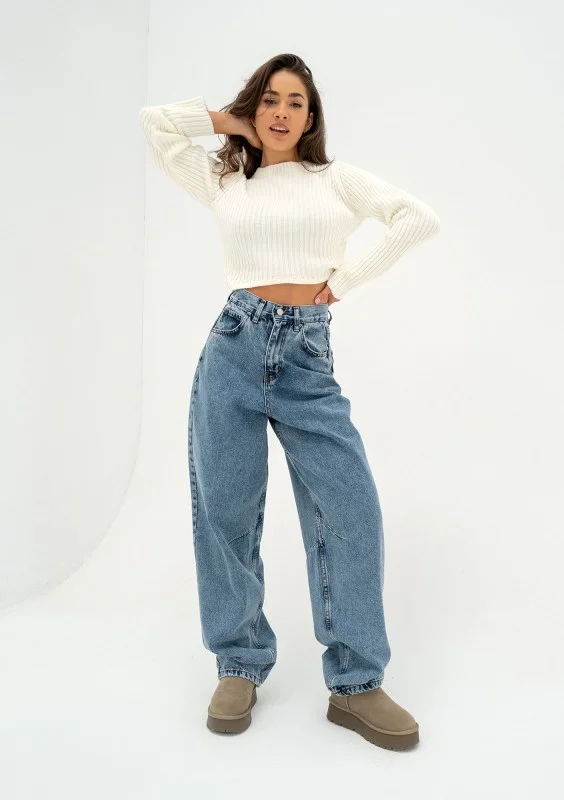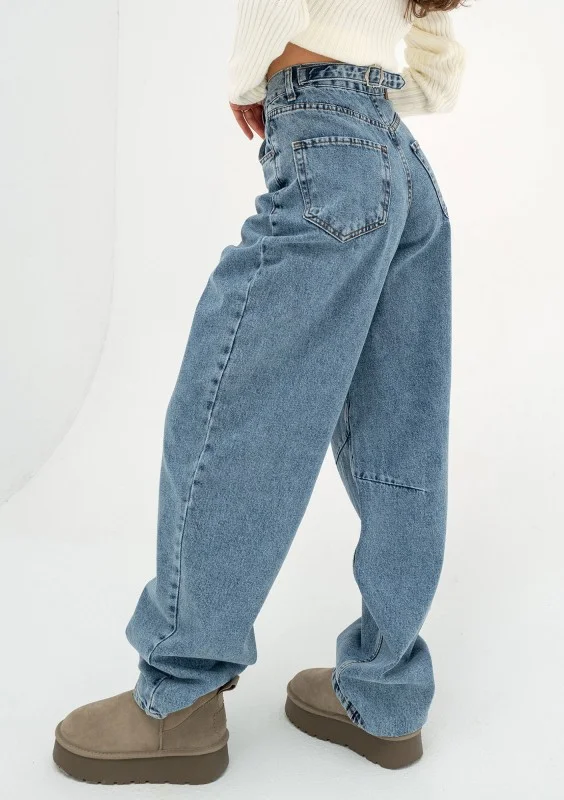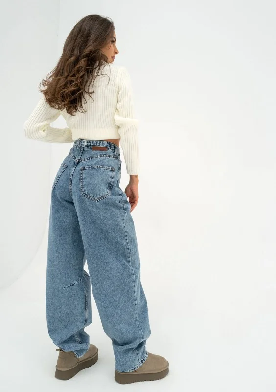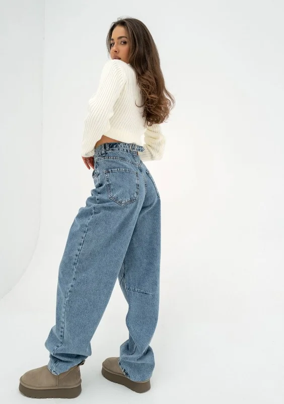 Mocno szerokie jeansy damskie typu baggy, z wysoką talią i regulacją obwodu. Spodnie harmonijnie współgrają z proporcjami sylwetki.