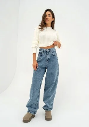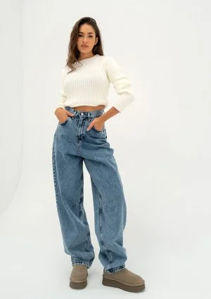 Jeansy damskie ,,Yeah" to gratka dla miłośniczki szerokich, workowatych nogawek. Spodnie jeansowe dodają charakteru stylizacji i są bardzo wygodne. Zostały starannie zaprojektowane w myśl zasady, by pomimo formy oversize dodawały sylwetce atrakcyjności. Na wizualny sukces pracuje przemyślany krój i wielkość tylnych kieszeni, a także pasy regulujące obwód w talii. To ostatnie, sprytne rozwiązanie pozwoli Ci się cieszyć odpowiednim dopasowaniem rozmiaru nie tylko do swojej sylwetki, ale i okresowych wahań obwodów. Prezentowany model został wykonany z 100% bawełnianego dżinsu, w jasnym odcieniu błękitnym.