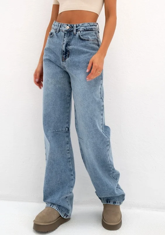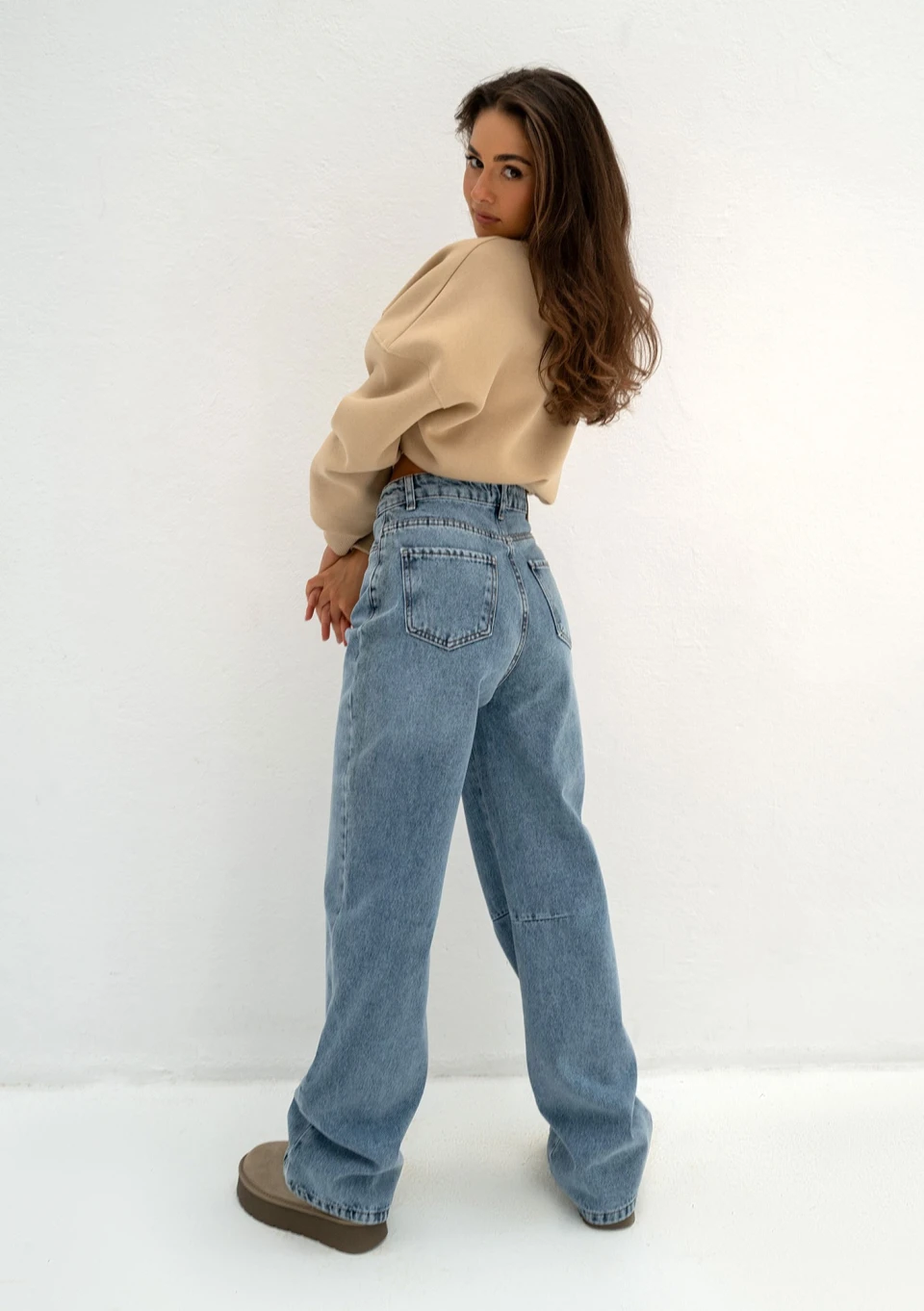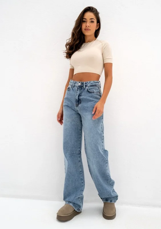 Błękitne jeansy damskie palazzo z delikatnie poszerzonym krojem nogawek i wyższym stanem. Rock to jeden z naszych najbardziej wszechstronnych fasonów.