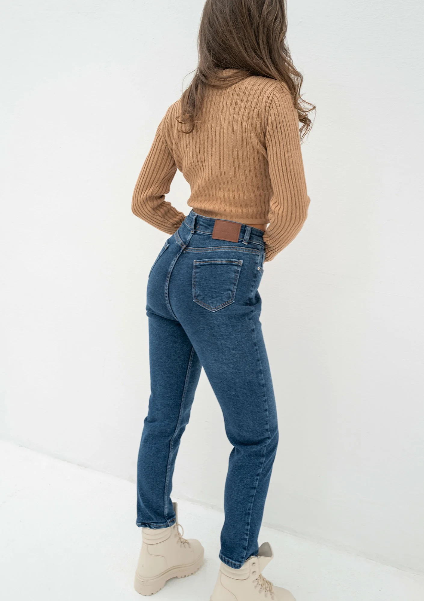 Damskie spodnie jeansowe mom fit są świetną alternatywą dla fasonów typu slim. Czym się charakteryzuje rodzaj mom? Ma prostą, dopasowaną nogawkę, lecz nie obcisłą jak w rurkach typu slim. Nogawka też jest nieco krótsza, dlatego ten fason przypomina cygaretki. Dzięki temu świetnie ,,odnajdują się" w eleganckim ubiorze, na przykład w zestawieniu z koszulą, marynarką i oxfordami. Wysoki stan zapewnia estetyczne, jak i wygodne ułożenie w pasie. Prezentowany model został wykonany z denimu wpartego elastanem, dlatego jest delikatnie sprężysty i dopasowuje się do sylwetki. Jeansy damskie mom fit proponujemy także w czarnym kolorze.