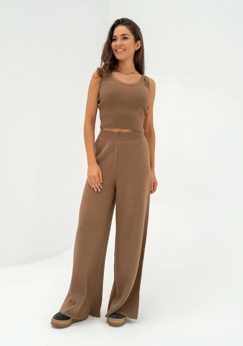 Modne spodnie damskie z miękkiej dzianiny w kamelowym kolorze. Zachowują luźną, wygodną formę i są niezwykle wszechstronne!