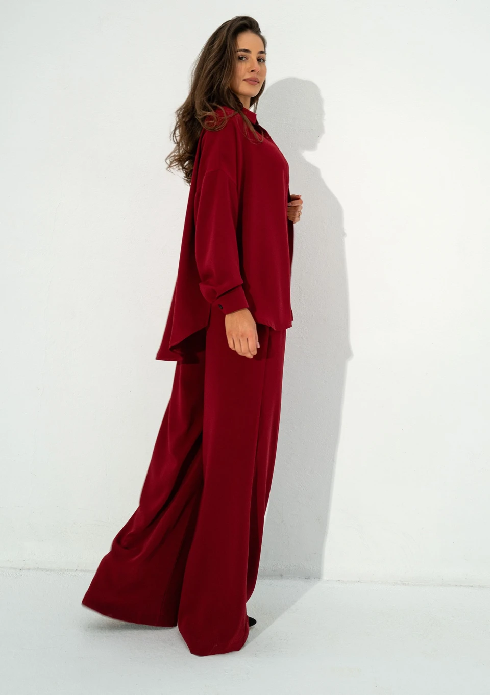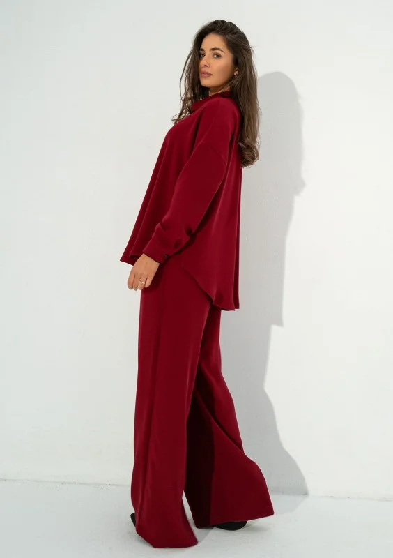 Wygodne i zwiewne spodnie z luźną i szeroką nogawką. Model w modnym, bordowym kolorze na logowanej gumce.