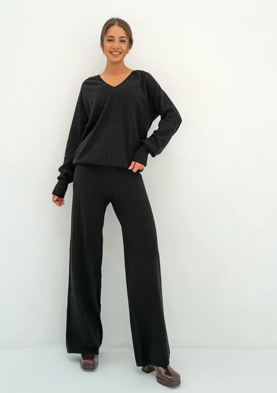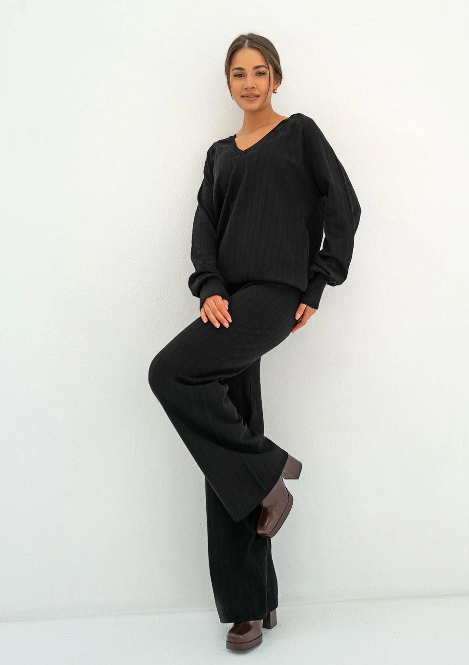 Wygodne spodnie dzianinowe z wyjątkowym zdobieniem ażurowych lampasów. Wykonane w czarnym kolorze. Model z luźną nogawką.