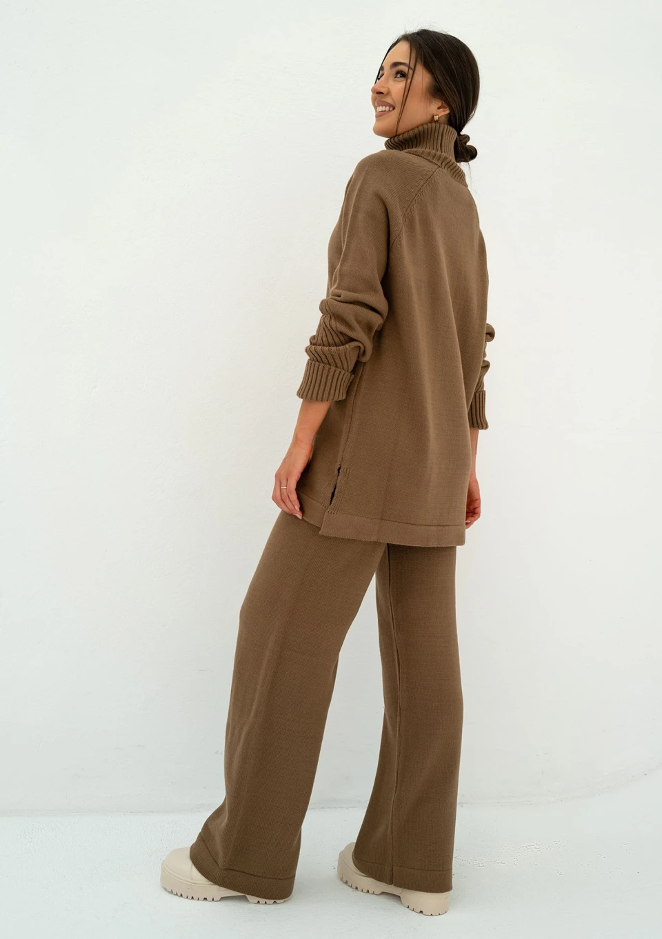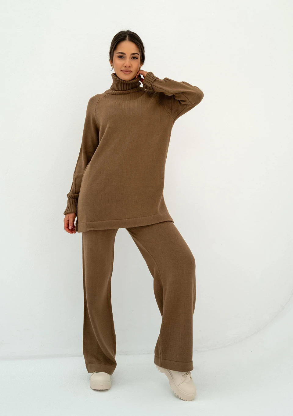 Proste rozwiązania to podstawa wygody i ekspresowego wyboru codziennego outfitu. Wzbogacając swoją szafę o ciepłe spodnie dzianinowe w brązowym kolorze będziesz przygotowana na wiele prostych okazji. Nasz model Oudhy jest komfortowo luźny, posiada wysoki stan. Miękka włóczka składa się w całości z akrylu, który nie podrażnia skóry i nie powoduje reakcji alergicznych. Do tych spodni możesz dobrać luźny, długi sweter w tym samym kolorze.