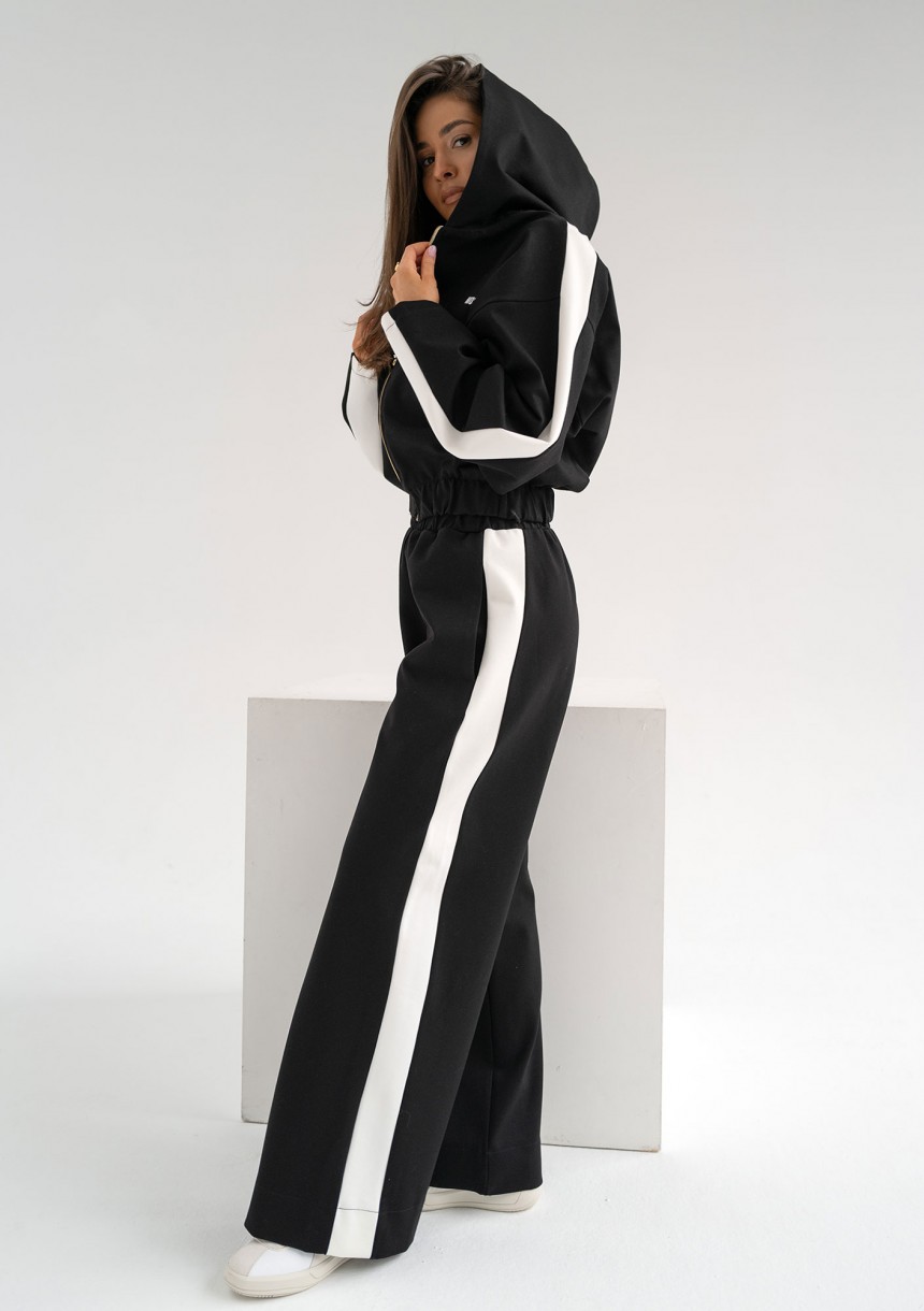 Czarne spodnie z modnymi lampasami odmienią Twój styl! Dusty to wygodny, sportowy fason z szeroką nogawką. Spodnie zostały wykonane z wytrzymałego materiału.