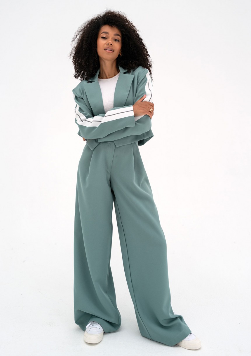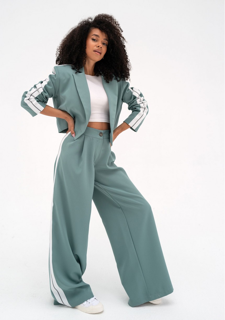 Stylowe spodnie damskie z szeroką nogawką w niebieskim kolorze. Lampasy po bokach dodają odrobinę sportowego charakteru.