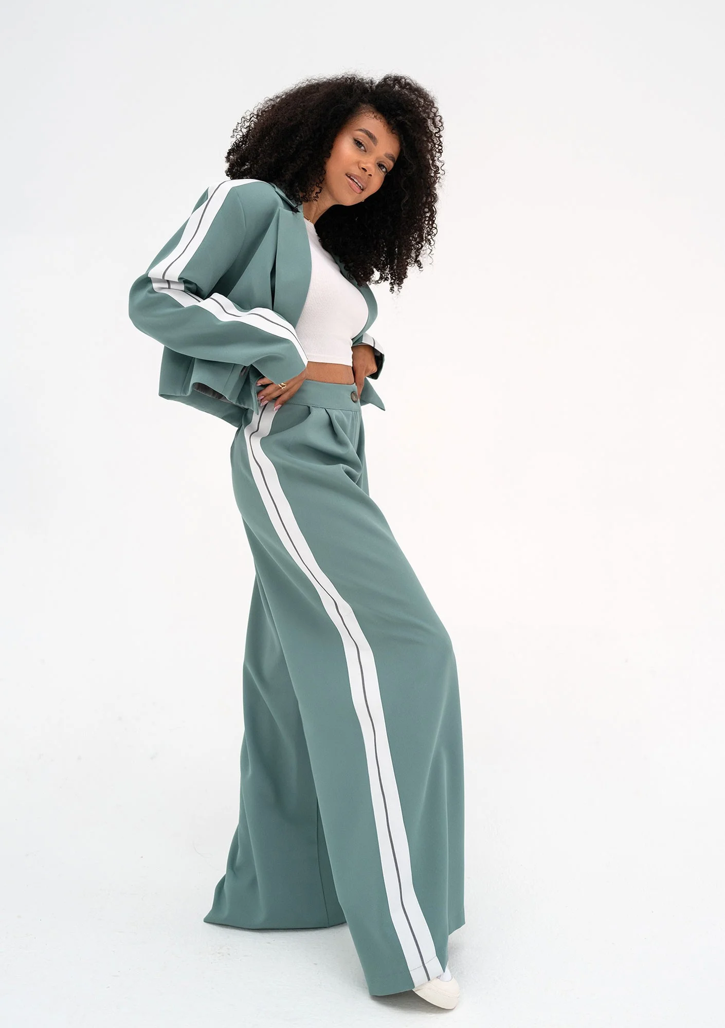 Stylowe spodnie damskie Cora z modną, szeroką nogawką idealnie ułożą się na każdej sylwetce. Odrobinę wysoki stan podkreśla talię i wydłuża nogi, co sprawia, że sylwetka wygląda proporcjonalnie i kobieco. Model został wykonany z lekkiego, przewiewnego materiału, który zapewnia komfort noszenia nawet w cieplejsze dni. Stwórz idealną stylizację na wiosnę wraz z dedykowaną marynarką.