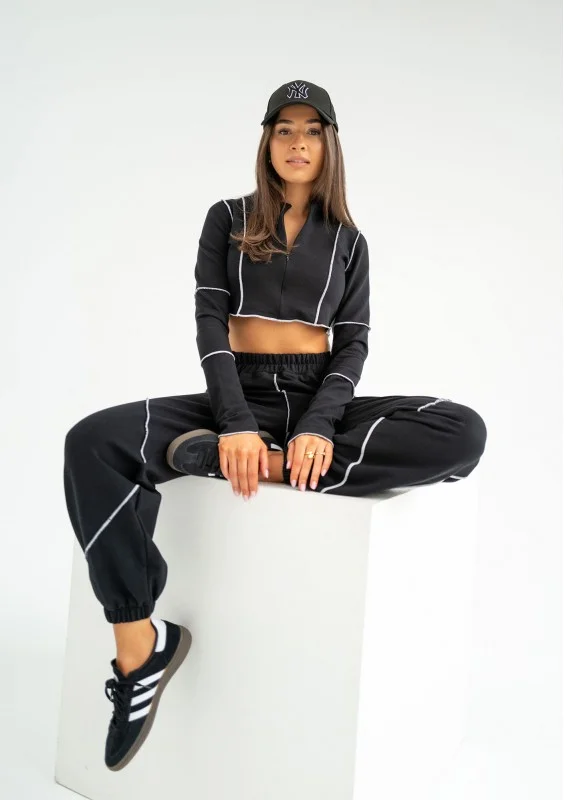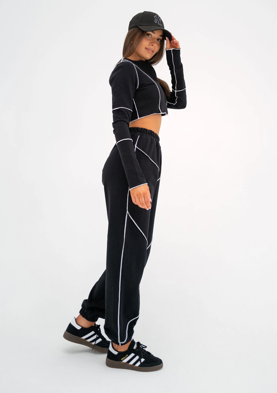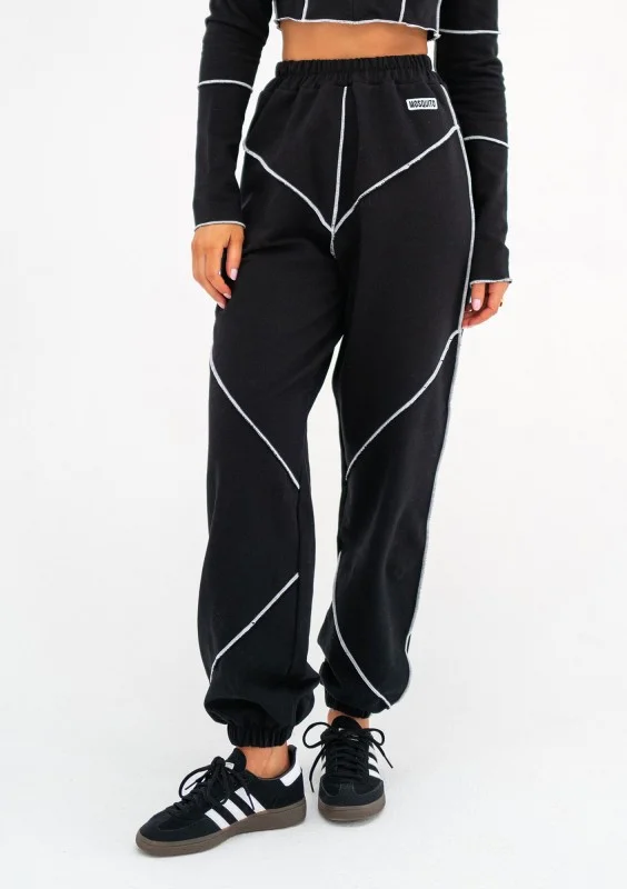 Stylowe, czarne spodnie dresowe o luźnym kroju z designerskim obszyciem. Wiosenne, wykonane z lekkiej bawełny.
