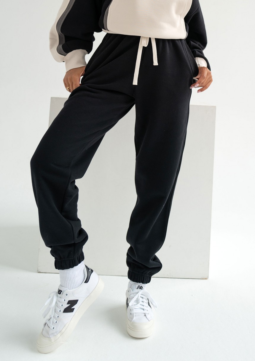 Czarne spodnie dresowe o luźnym kroju, wykończone gumkami. Model z lekkiej dzianiny pętelkowej, wsparty troczkami i kieszeniami.