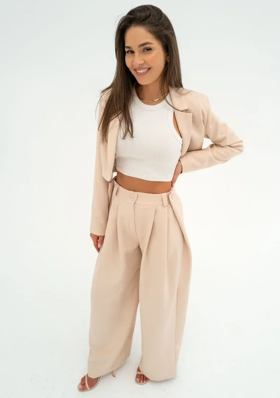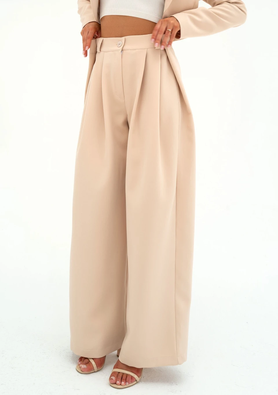 Beżowe spodnie damskie z modną, szeroką nogawką. Mocno oversizowe i niezwykle stylowe! Wykonane z eleganckiej, niegniotącej się tkaniny.