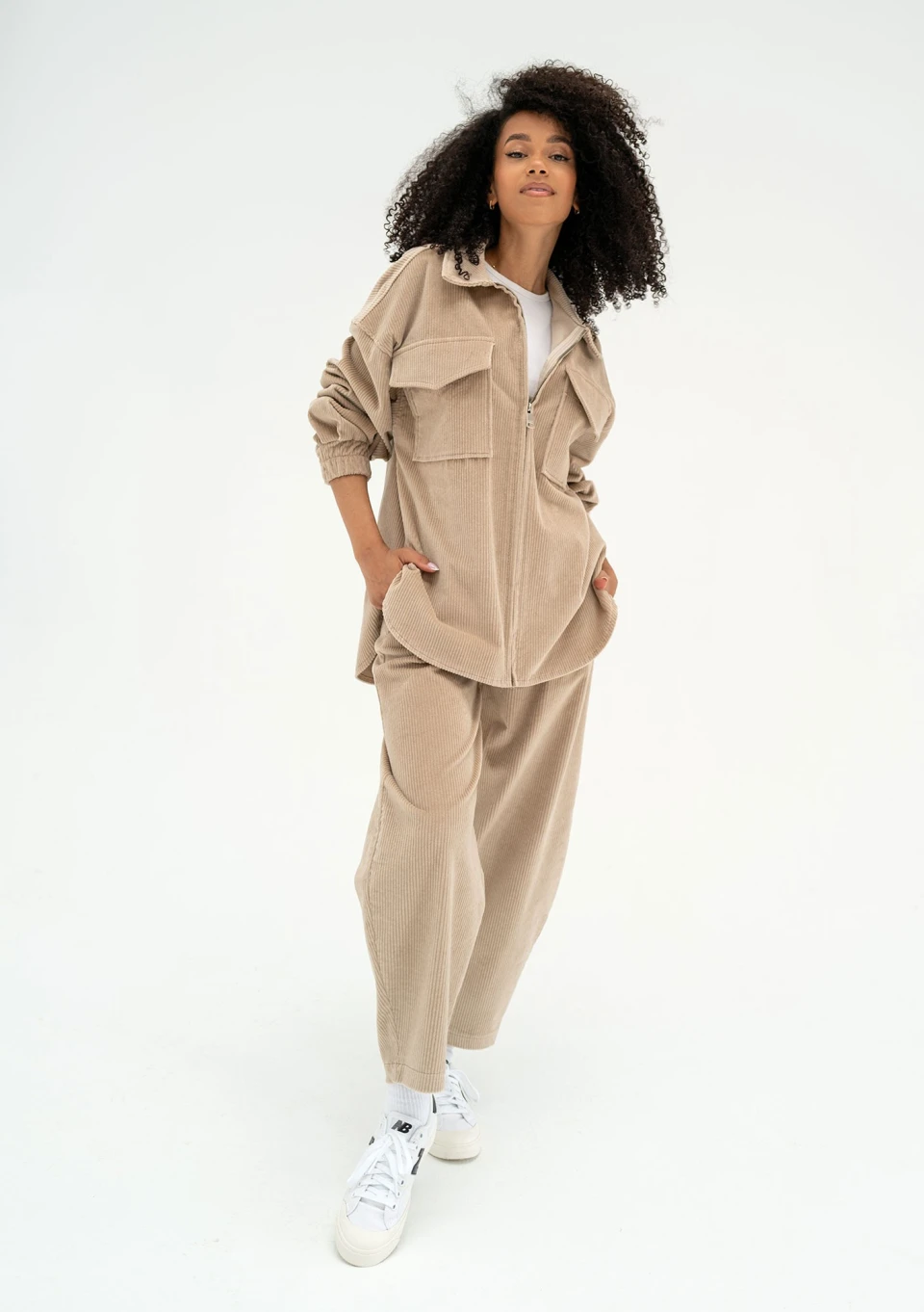 Modne spodnie damskie ze sztruksu, bawełniane. Model o wygodnym kroju z troczkami i kieszeniami. Wykonane w beżowym kolorze.