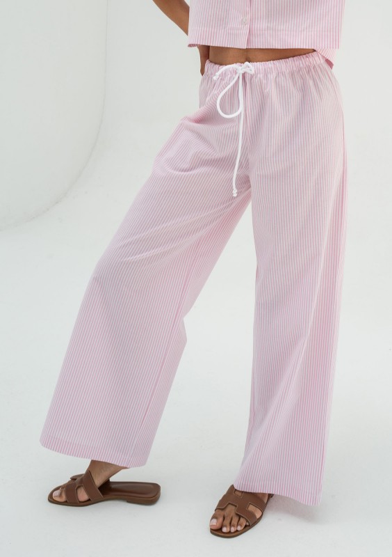 Lekkie i wygodne spodnie damskie z bardzo zwiewnej tkaniny bawełnianej. Fason w urokliwy wzór różowych prążków.