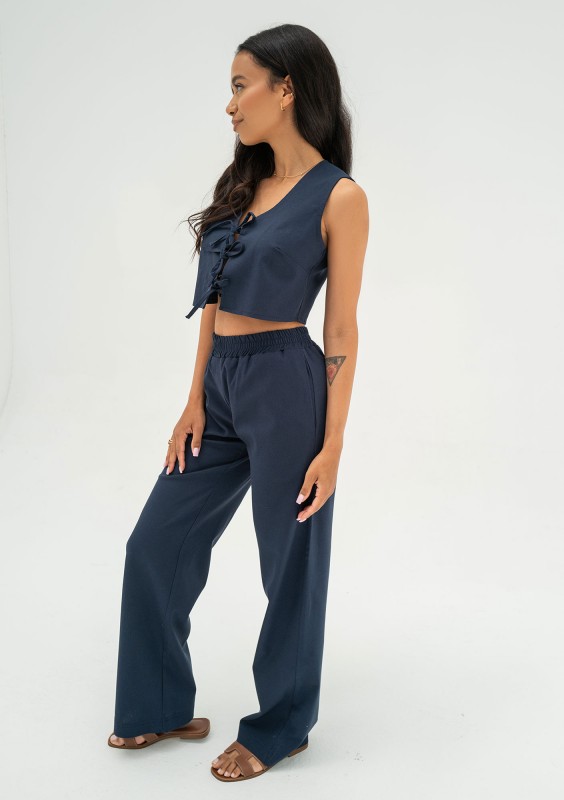 Długie, komfortowe spodnie damskie z lnu na letnie dni. Model w uniwersalnym, granatowym kolorze. Z wygodną gumką i kieszeniami.