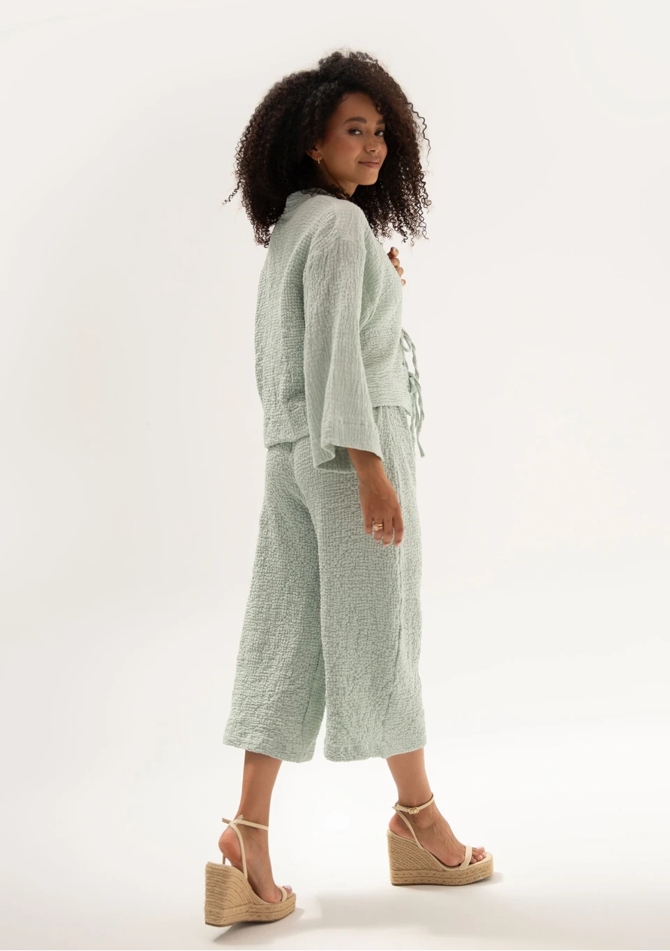 Oto stylowe damskie spodnie o fasonie culotte, idealne na wakacje, wykonane z naturalnego muślinu w miętowym odcieniu. Przewiewna i miękka forma tkaniny kojarzy się z wakacyjnym luzem i komfortem – spakuj je do wakacyjnej walizki, będą gotowe na spontaniczny spacer po plaży, zwiedzanie czy popołudniową kawę w nadmorskiej kawiarni. Wygodne, lekkie i wszechstronne, możesz połączyć je z dedykowanym kimonem.