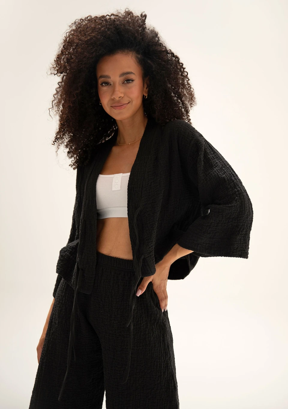 Szerokie, sięgające do połowy łydki nogawki tych spodni gwarantują swobodę i świetną wentylację, niezbędną w gorące dni. Są idealne do tworzenia zarówno luźnych, jak i stylowych wakacyjnych outfitów. Muślin, dzięki swojej lekkości i przewiewności, to doskonały wybór na lato – pozwala skórze oddychać i jest niezwykle przyjemny w dotyku. Co więcej, jego naturalnie pognieciona struktura eliminuje potrzebę prasowania, co jest ogromną wygodą, zwłaszcza podczas podróży. Stylizacja Cali w czarnym kolorze przyda Ci się na każdą letnią wycieczkę, codzienne spotkania i spacery.
