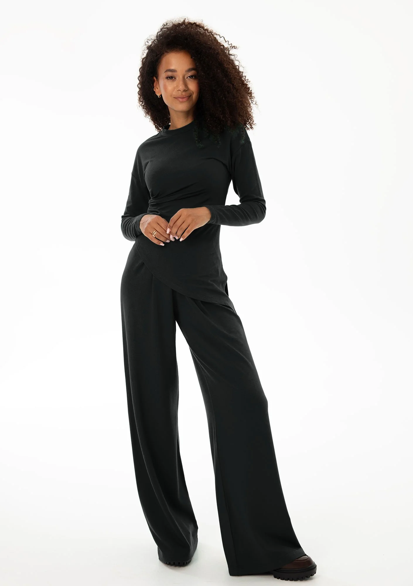 Te super wygodne spodnie damskie z wiskozy możesz wystylizować na wiele sposobów. Naszą propozycję stanowią trzy różne topy z długim rękawem, z którymi fason Nova stworzy spójny komplet i gotową bazę pod same dodatki. Czarne spodnie z kontrafałdą jak i dedykowane bluzki zostały uszyte z miękkiej, gładko wykończonej dzianiny wiskozowej. Materiał jest gęsty, idealny do noszenia w porze przejściowej.