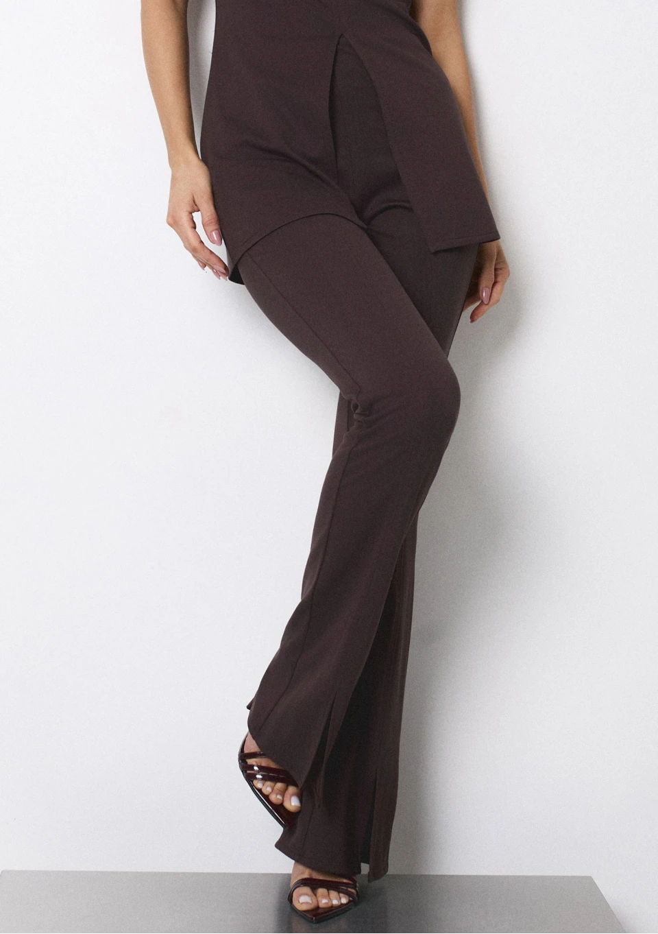 Eleganckie spodnie damskie o wysmuklonej formie, z eleganckim rozcięciem nogawek. Wykonane w brązowym kolorze.