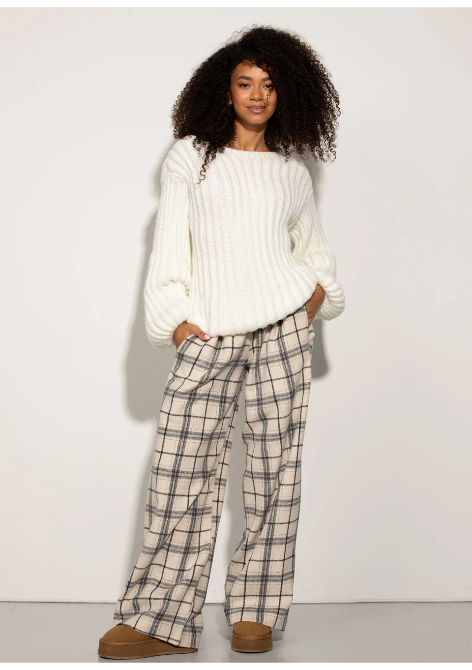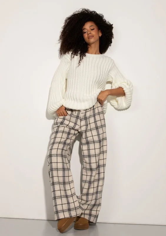 Miękkie i wygodne spodnie flanelowe, w sam raz do przytulnych, zimowych outfitów. Wykonane w modnej, kremowej estetyce kraty.