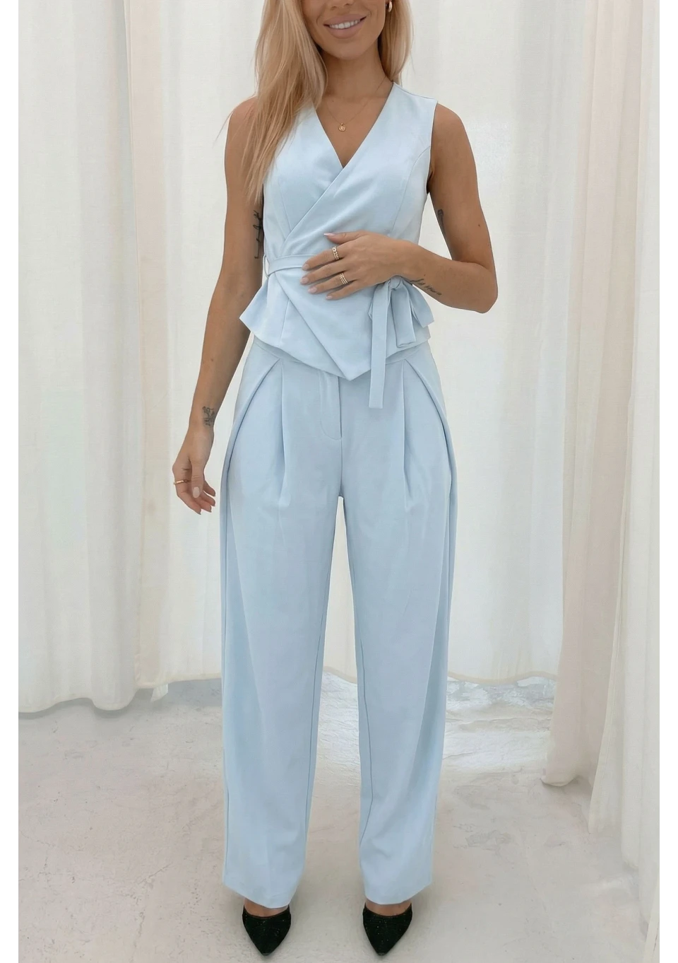 Jak zachować elegancję w upalne dni? Nie tylko sukienki zapewniają zwiewny, a zarazem szykowny look. Postaw na monochromatyczny komplet wykonany z lnu i wiskozy. Okryta taką lekką i przewiewną tkaniną zachowasz poczucie świeżości i komfortu, a Twój wizerunek będzie nienaganny. Spodnie mają szykowny krój typu paperbag, z zakładkami. Możesz połączyć je z koszulą Tammy lub kamizelką o kopertowym kroju.
