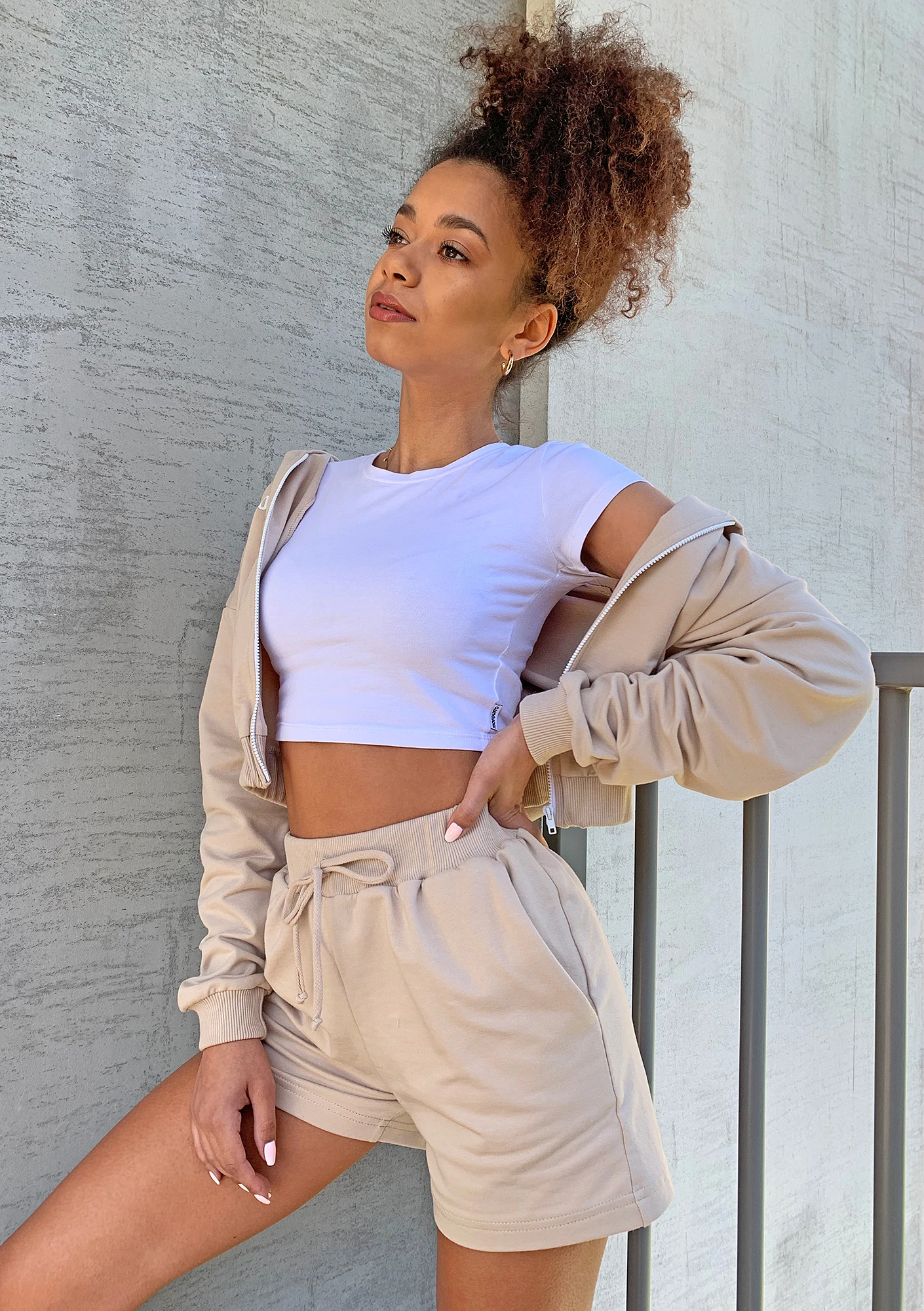 Spodnie dresowe typu szorty to prawdziwy strzał w dziesiątkę. Wybrany model wykonany jest w 95% z bawełny i w 5% z laycry. Dzięki temu są niezwykle przyjemne w dotyku i miłe, a jednocześnie rozciągliwe i dopasowujące się. Ich noszenie to czysta przyjemność. Materiały są najwyższej jakości, dzięki czemu spodenki nie rozciągają się ani nie mechacą nawet po wielu praniach. W pasie posiadają ściągacz, który sprawia, że są one odpowiednio dopasowane, a za pomocą wygodnego sznurka zawsze można je poluźnić, albo poszerzyć. Dzięki temu rozmiarówka jest bardzo elastyczna. Długością sięgają do połowy uda. Na prawej nogawce u dołu znajduje się biały napis Mosquito, który doskonale kontrastuje z beżową całością. Na pewno jest to kolorystyka bardzo uniwersalna, na podstawie której stworzyć można wiele ponadczasowych stylizacji.