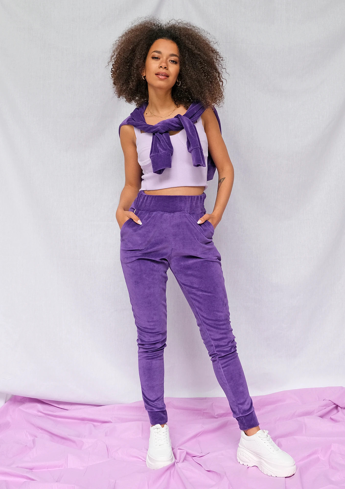 Spodnie dresowe tak naprawdę powinny znaleźć się w garderobie każdej kobiety, która lubi wygodę połączoną z najnowszymi trendami. Właśnie taki jest model velvet. Spodnie damskie wykonane zostały w 95% z bawełny oraz w 5% z elastanu. Dzięki temu są bardzo przyjemne w dotyku oraz miękkie, ale jednocześnie dopasowują się do konkretnej sylwetki oraz zachowują idealny wygląd nawet po wielu praniach. Kuszący jest już ich sama kolorystyka. Intensywny fiolet, który przypomina dojrzałe śliwki, to zdecydowanie odcień tego sezonu i warto mieć w swojej szafie przynajmniej jedno ubranie w takiej kolorystyce. Dodatkowo są to damskie spodnie z wyższym stanem, a więc zasłaniają one część brzucha i są bardzo wygodne, ponieważ nie zsuwają się podczas chodzenia czy siadania. Dba o to szeroka gumka w pasie, która trzyma je na swoim miejscu przez cały dzień. Oprócz tego po obydwu stronach wykonane zostały kieszenie, które idealnie nadają się do przechowywania drobnych rzeczy. Idealnie pasować będą one do naszej bluzy velvet w tym samym kolorze!