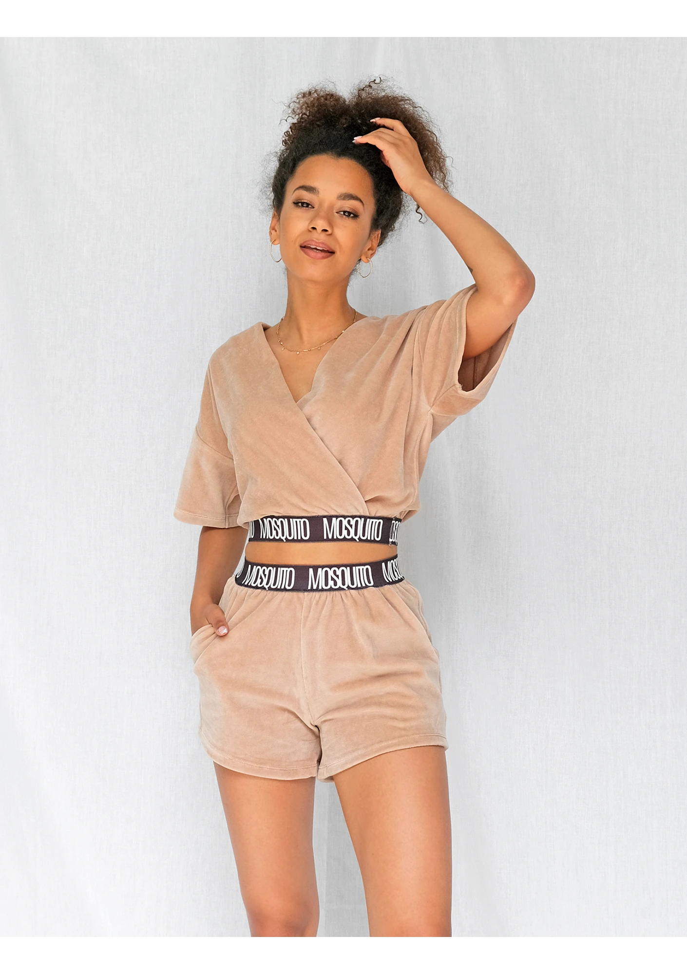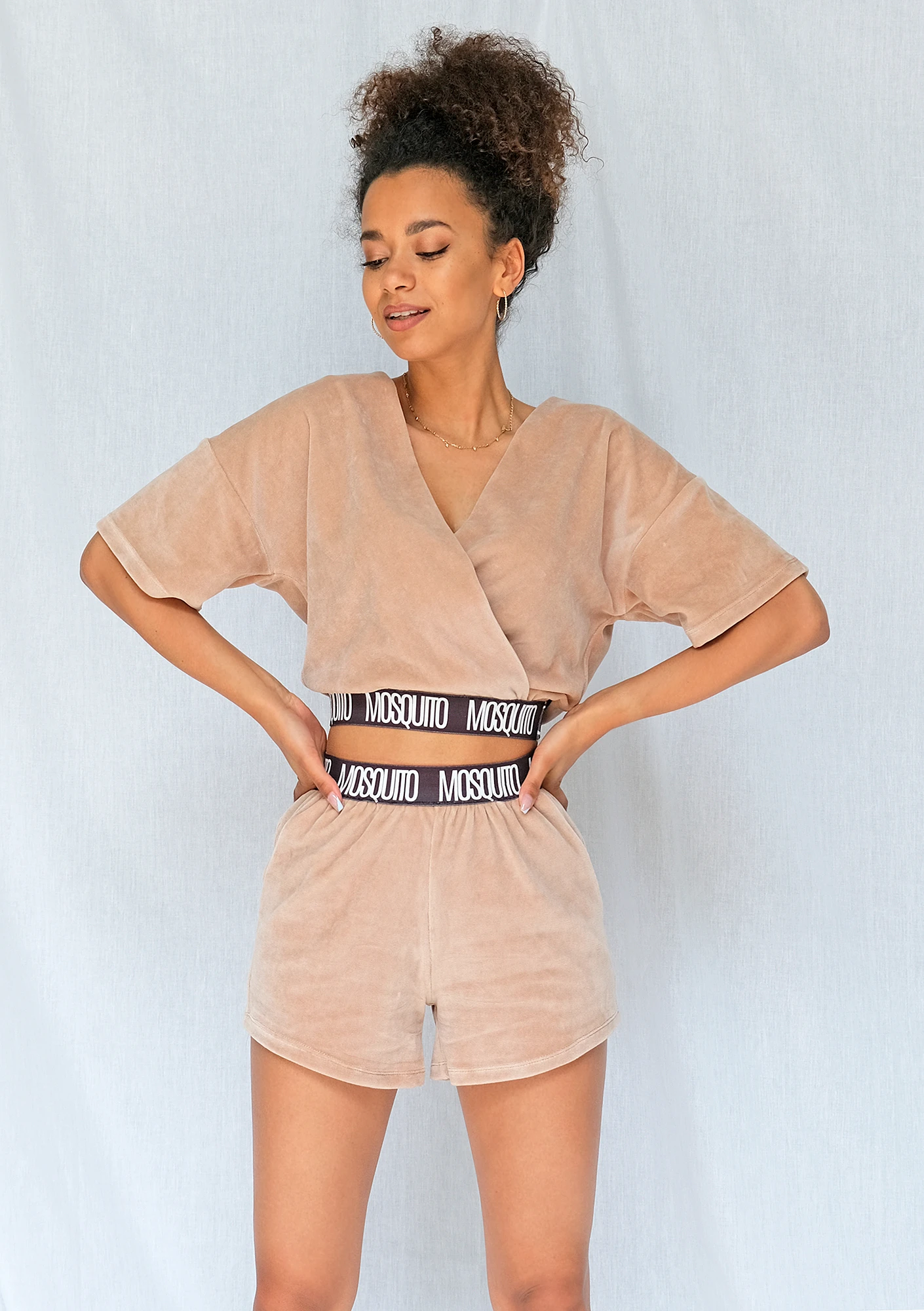 Doskonałe samopoczucie i wygoda latem to priorytety. Bez dobrych damskich spodenek trudno sobie wyobrazić udane lato. Powyższy model sprawdzi się na co dzień i zawsze, kiedy będziemy chciały wyeksponować nogi. Wyższy stan podkreśla kobiece proporcje i wydłuża nogi. To spodenki, które są warte zainteresowania również ze względu na ponadczasową kolorystykę. Kolory nude stanowią świetną podstawę wielu stylizacji, a czarny pas z białym napisem dodaje intrygującego charakteru. Wybierz więc spodenki, które zapewnią Ci wakacje w dobrym stylu. Dopasujesz je do klasycznych balerin i sportowego obuwia. Taki zestaw to definicja pewności siebie i dziewczęcego uroku. Beżowe szorty z weluru świetnie będą komponowały się z klasycznym topem lub kopertowa bluzką w zestawie. Miękkość weluru sprawia, że ubrania z niego wykonane są tymi najchętniej wyciąganymi z szafy.