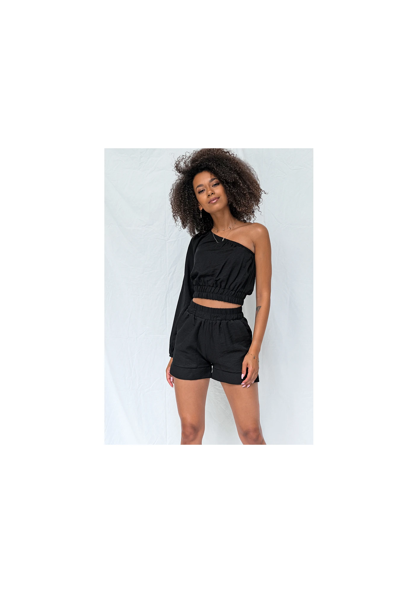 Podwyższony stan i luźne nogawki to przepis na krótkie spodnie damskie, które w perfekcyjny sposób eksponują kobiecą sylwetkę. Atutem prezentowanego modelu będzie także jego ciemny, mocno nasycony czarny kolor, zapewniający efekt optycznego wyszczuplenia. Spodenki doskonale nadają się do zestawień codziennych i bardziej wizytowych. Można bowiem bez obaw połączyć je z białą koszulą, aby stworzyć stylizację odpowiednią na przykład do szkoły czy pracy. Chociaż szorty należą do pełnego zestawu, w którym łączą się z asymetrycznym czarnym topem, to bez trudu znajdziesz do nich równie efektowną "drugą połówkę" we własnej garderobie. Z koszulką typu T-shirt zaprezentują się casualowo, a ze zwiewną bluzeczką bardziej romantycznie.