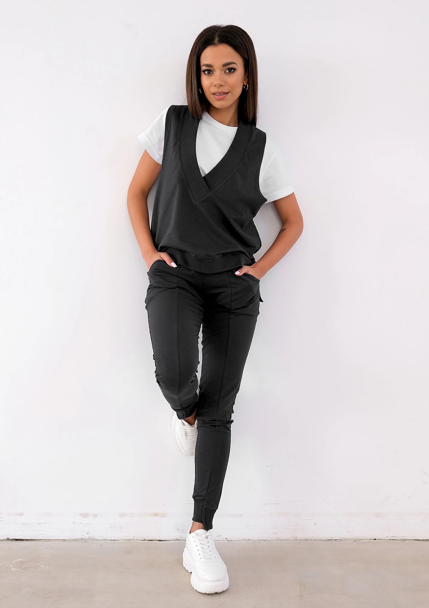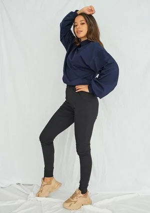 Nogawki zakończono zwężeniem w kostce. Dzięki temu damskie spodnie nie podwijają się podczas chodzenia. Pod biodrami znajdują się dwie kieszonki na drobne przedmioty. Spodnie mają podwyższony stan, stąd dobrze maskują odstający brzuch i optycznie wysmuklają sylwetkę. W pasie utrzymują się na elastycznej gumie. Dopasowuje się ona do ciała i chroni przed przesuwaniem odzieży po skórze. Wzdłuż nogawek biegnie pionowe, asymetryczne przeszycie, urozmaicające klasyczny wygląd spodni. Ubranie jest uniwersalne. Założysz je do bluzy i koszulki na co dzień lub do bluzki "hiszpanki" do pracy.