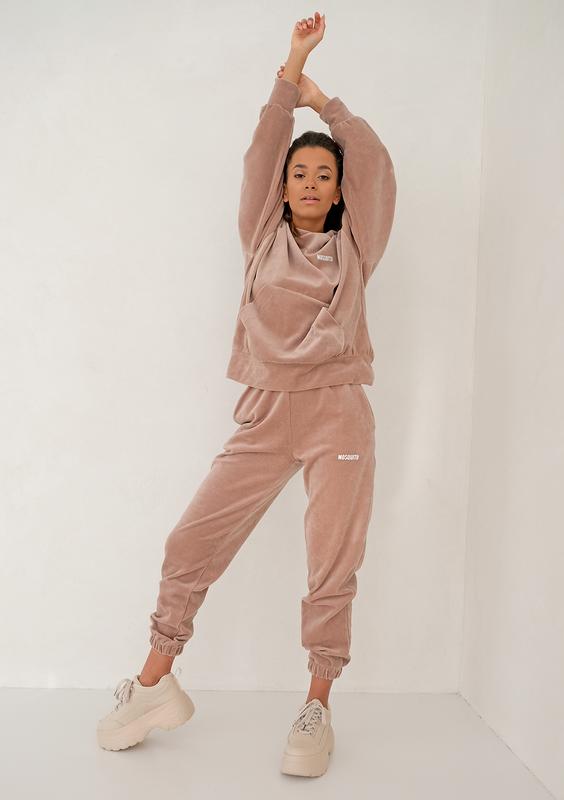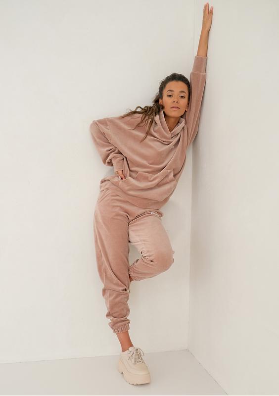 Ponadczasowe spodnie dresowe szyte z lśniącej dzianiny welurowej, w odcieniu zabielonej mlekiem kawy. Fason z wygodnymi gumami w pasie i kostkach oraz dwoma kieszonkami.