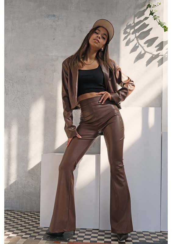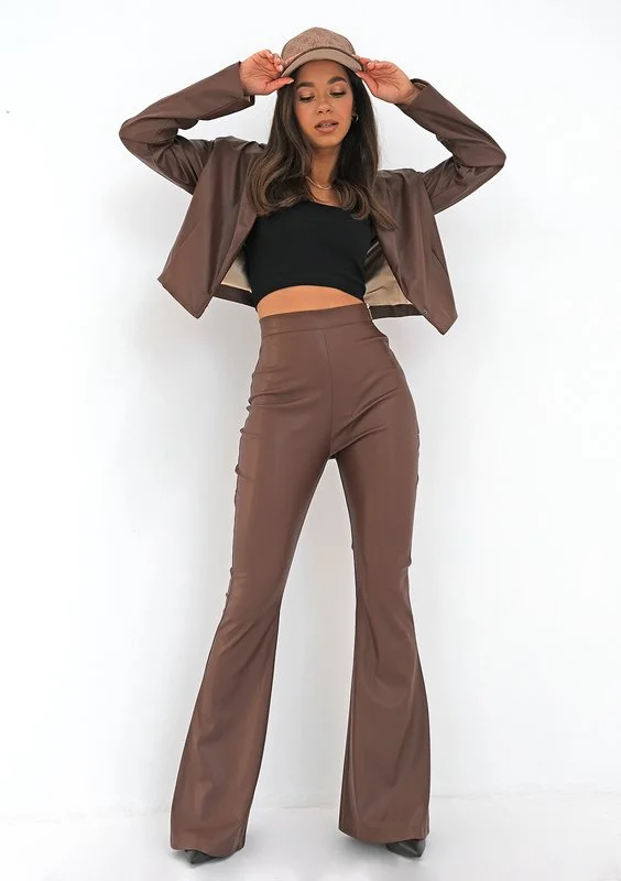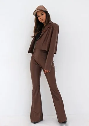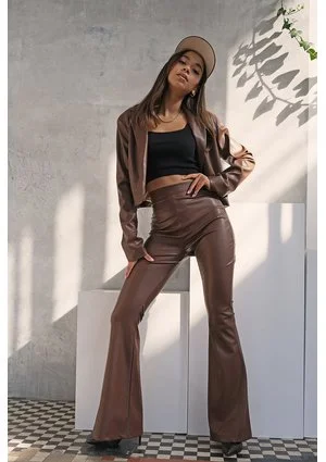 Sheny - Spodnie dzwony z eko skóry Brązowe