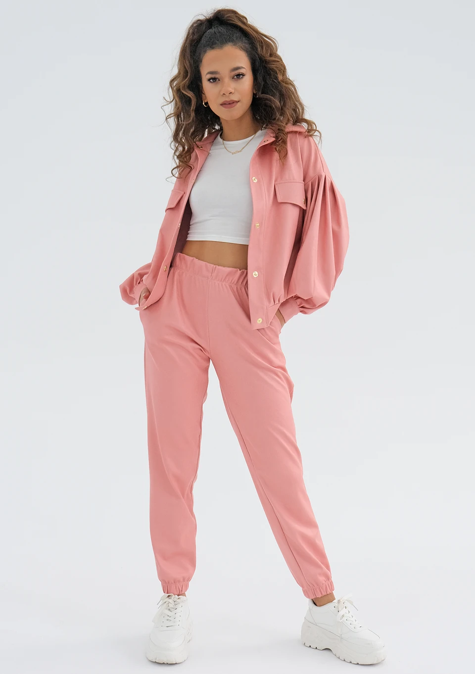 Wyjątkowe spodnie dresowe wykonane z miękkiej tkaniny o wyglądzie skóry. Mają wygodny, joggerowy fason z kieszonkami i elastycznymi gumami w kostkach i pasie. Model w kobiecym, różowym odcieniu.