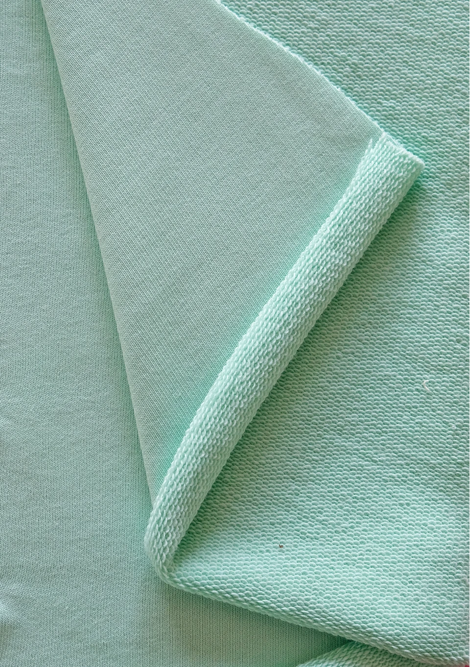 Skład 90% bawełna, 10% poliester. Jest to materiał o średniej gramaturze, z pętelkową fakturą od wewnątrz i wykończeniem zapewniającym dodatkową miękkość. Ostatnie zdjęcie ukazuje obie strony dzianiny.