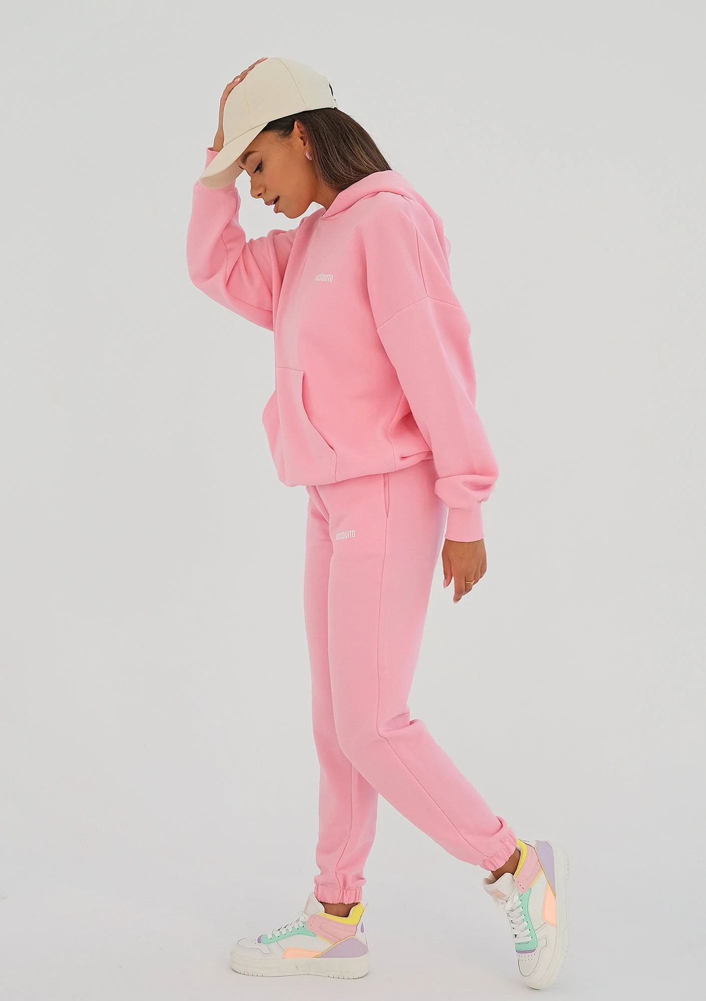 Różowe dresy możesz skomponować w fasonie Pure z dwoma bluzami w tym samym odcieniu: prostą bez kaptura, jak i z klasyczną kangurką. Pure to linia dresów bardzo luźnych, które prezentują się oversize’owo. Dzięki elastycznym ściągaczom spodnie wyglądają estetycznie i zapewniają spory komfort. To model z gumą w pasie i dwoma kieszeniami. Dla stylowego umieszczamy na nich drobny nadruk – białe logo. Spodnie są polskim produktem, szyjemy je w naszej szwalni w Tomaszowie Mazowieckim. Dostępne rozmiary to XS – L.