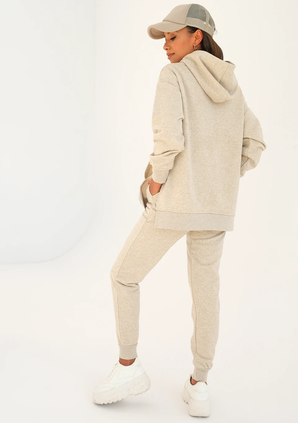 Fason odrobinę luźny, z gumą w pasie i ściągaczami w nogawkach.