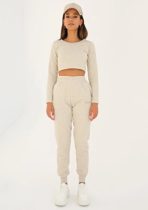 Beżowe spodnie dresowe o melanżowym wzorze, do stylizacji basic i sportowych. Posiadają wygodny, odrobinę dopasowany do sylwetki fason. Ozdobione subtelnym nadrukiem loga.