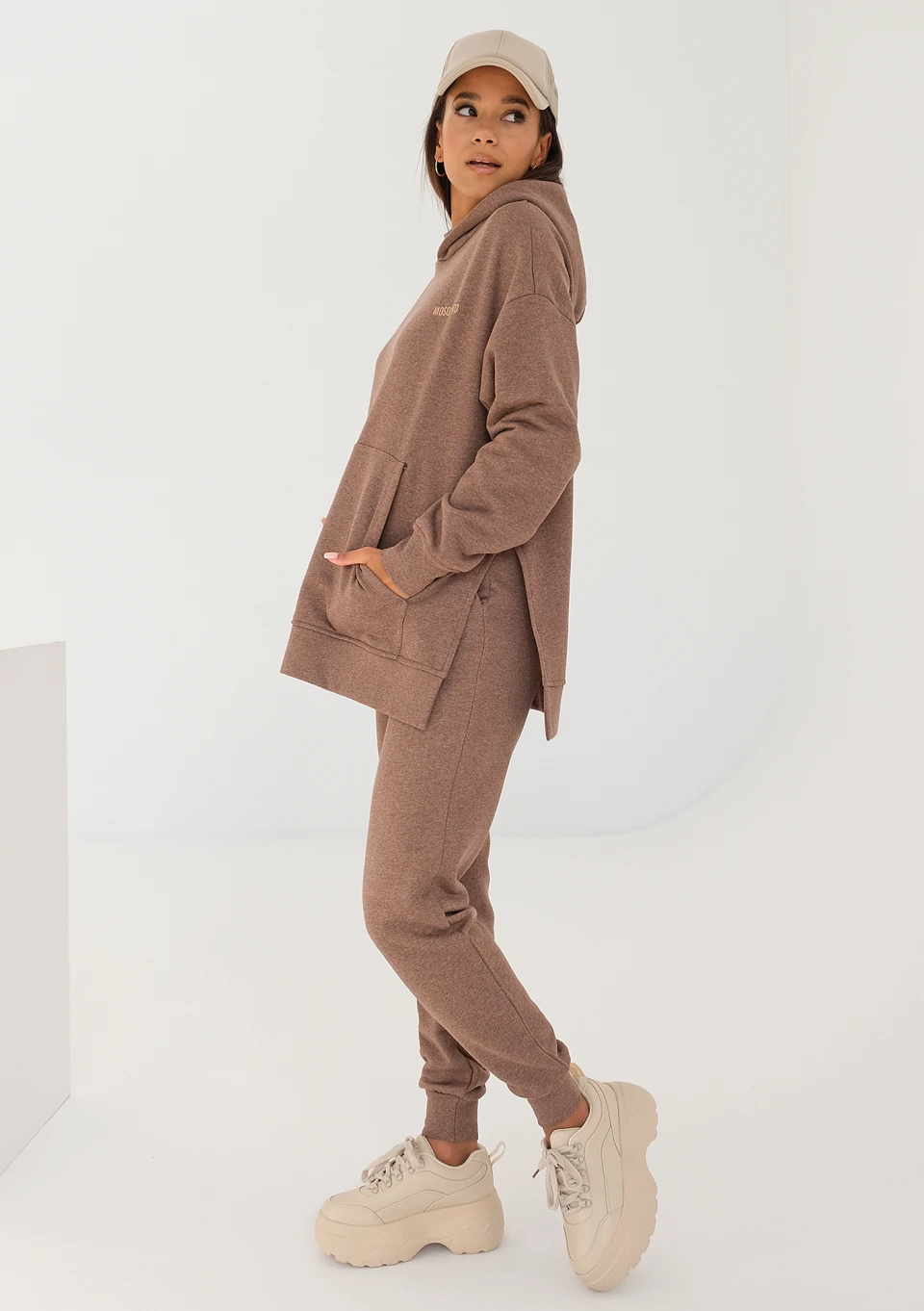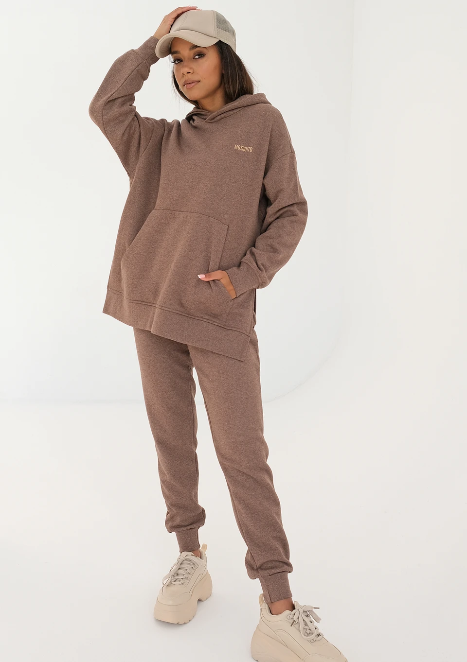 Melanżowe spodnie dresowe damskie w odcieniu kakao, dzięki którym stworzysz ponadczasowy i wygodny look w stylu sportowym i basic. Odrobinę dopasowane do sylwetki, subtelnie ozdobione logiem marki.
