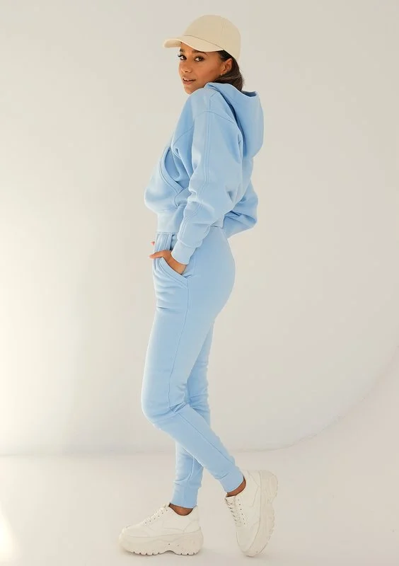 Błękitne spodnie dresowe z przyjemnie miękkiej dzianiny. Fason dopasowany, podkreślający sylwetkę.