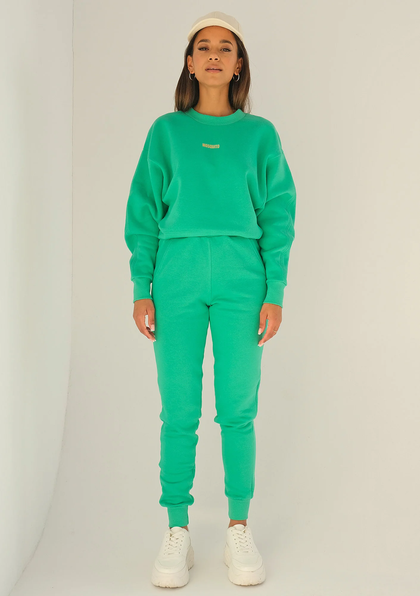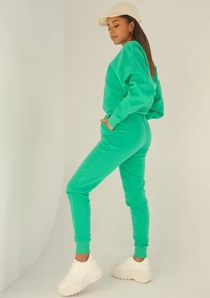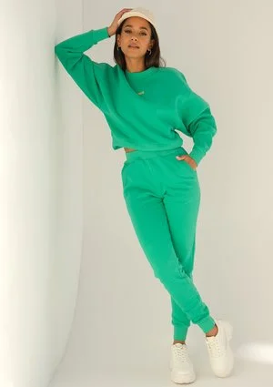 Spodnie ładnie układają się na sylwetce dzięki przemyślanemu układowi szwów, starannemu wykrojowi i szerokim ściągaczom. Jak wszystkie nasze sportowe modele, dres posiada gumę w talii. Po bokach znajdują się kieszenie. Zielona spodnie damskie dresowe są dostępne w szerokim zakresie rozmiarów: XS – XL. Stwórz efektowny, monochromatyczny look razem z bluzą w tym samym odcieniu. Szyjemy klasyczne, proste bluzy damskie z długim rękawem, jak i wygodne kangurki z kapturem.