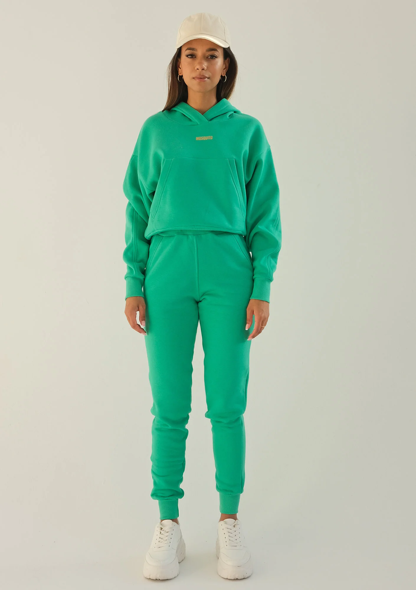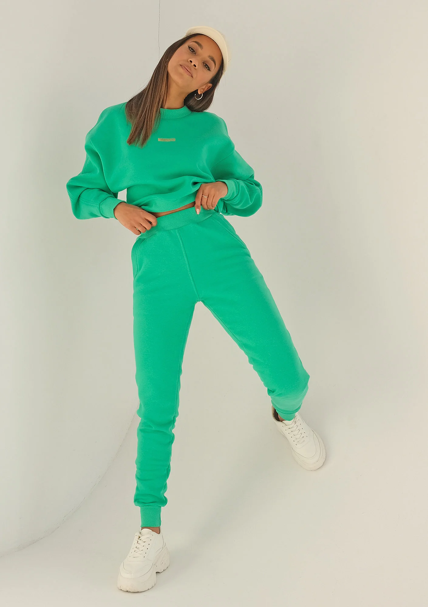 Dopasowane dresy damskie świetnie podkreślają sylwetkę, a przy tym zachowują sportowy, pełen luzu styl. Wiosną warto poeksperymentować z kolorami i zdecydować się na coś mocno przyciągającego uwagę! Zielone spodnie dresowe Venice spełnią to zadanie. Zapewnią Ci ciekawy i przyjemny dla oka, kolorowy look, a przy tym pełną wygodę. To fason wykonany z miękkiej dzianiny dresowej, którą od spodu wyścieła miły w dotyku meszek wydrapanych ze splotu włókien. Możesz zapoznać się z wyglądem faktury i grubością materiału, zerkając na ostatnie zdjęcie.