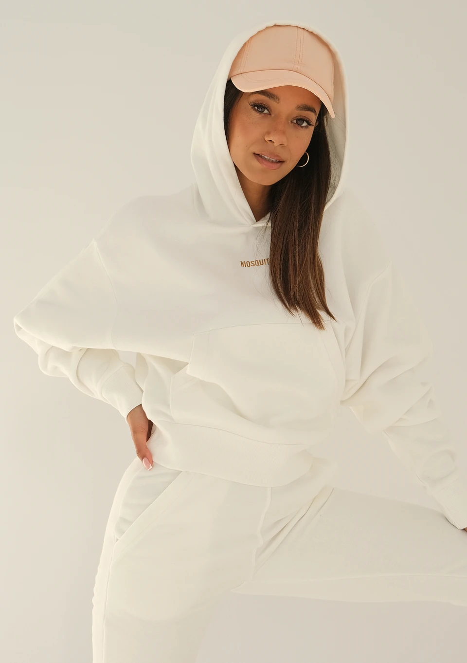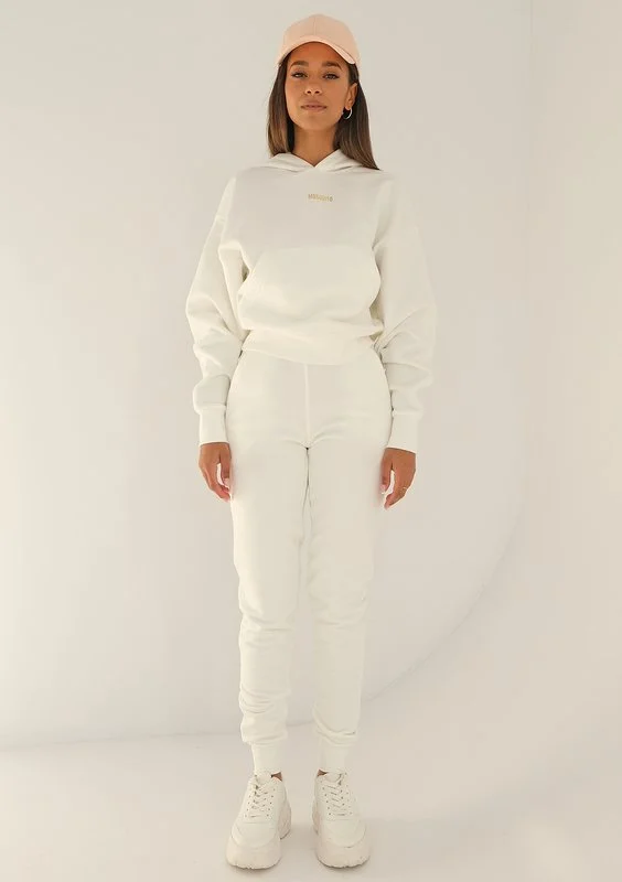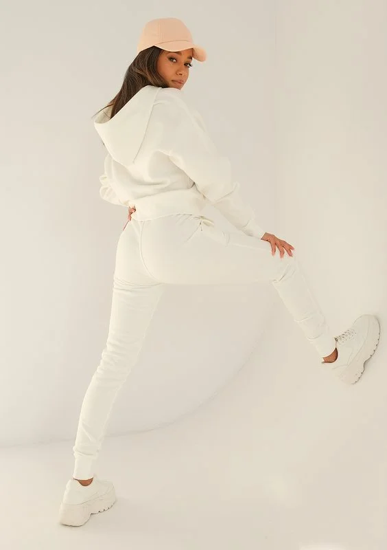 Kremowe spodnie dresowe, idealne do sportowych kompletów z bluzami w każdym kolorze. Szyte z miękkiej dzianiny, posiadają wygodny, odrobinę dopasowany fason.