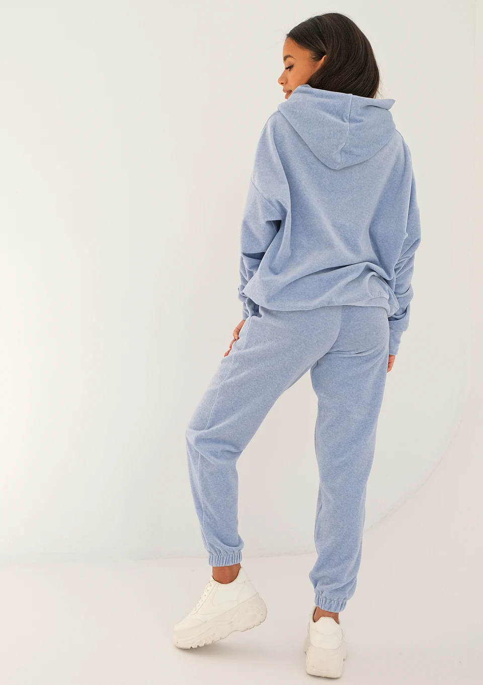 Wygodne spodnie dresowe z dzianiny welurowej o melanżowym deseniu. Błękitny model, który sprawdzi się w wielu sportowych stylizacjach.