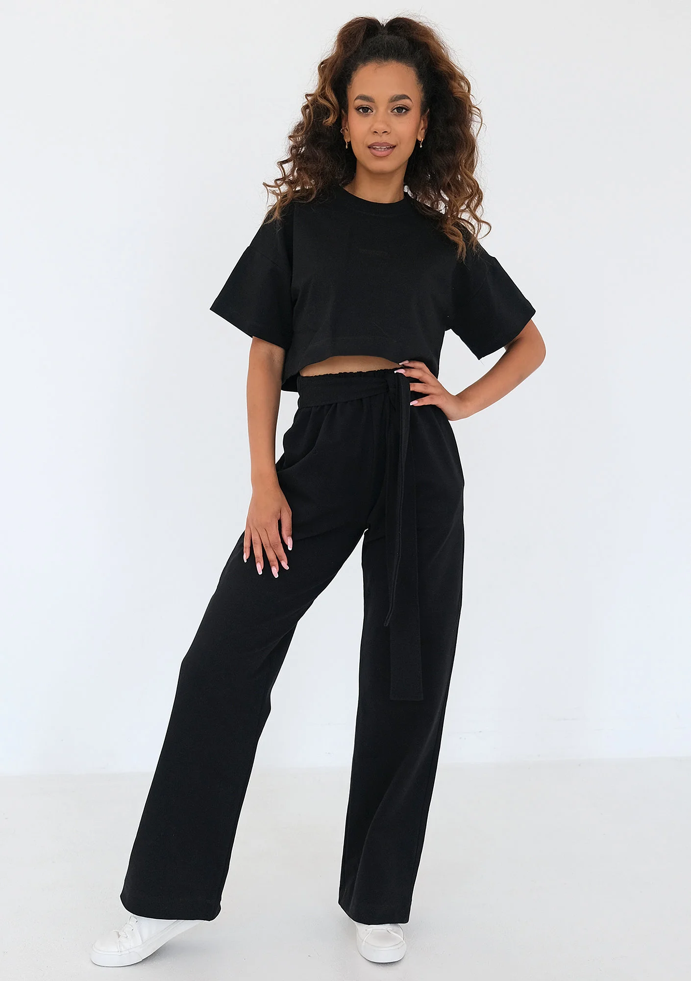 Czarne spodnie z najmodniejszymi, szerokimi nogawkami są wykonane w bardzo wygodnej, odrobinę sportowej formie. Jeśli w Twojej szafie brakuje uniwersalnych fasonów na co dzień, prezentowany model zapełni tę pustkę! Wykonane są z przyjemnego w użytku materiału – to bardzo elastyczna dzianina, w której składzie znajduje się naturalna bawełna.