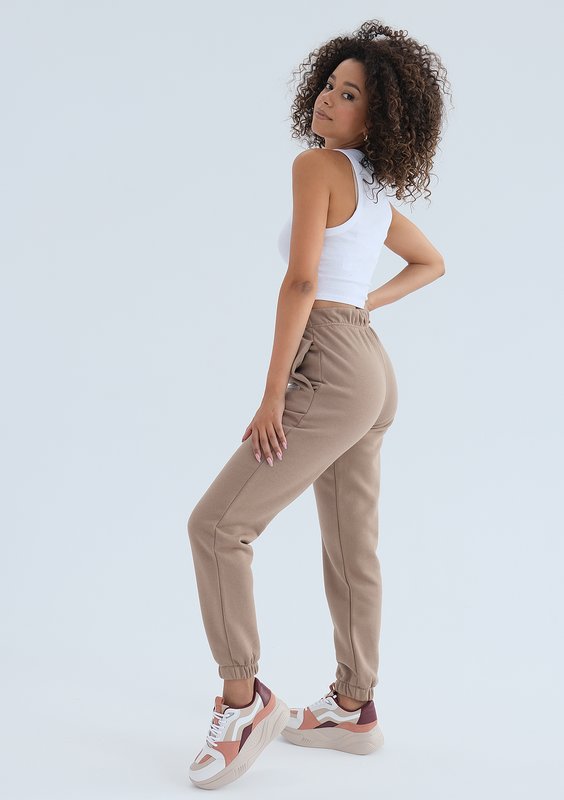 Beżowe spodnie dresowe w odcieniu kawy to luźny fason w stylu oversize. Zapewnią Ci wygodę i stylowy look w każdym sezonie, jako że dresy damskie już na stałe rozgościły się w trendach ) Spodnie są wykonane w polskiej szwalni, z miękkiej dzianiny. W składzie materiału dominują naturalne włókna bawełniane.